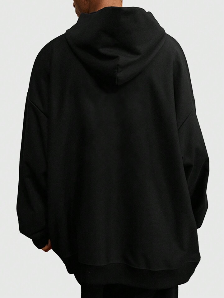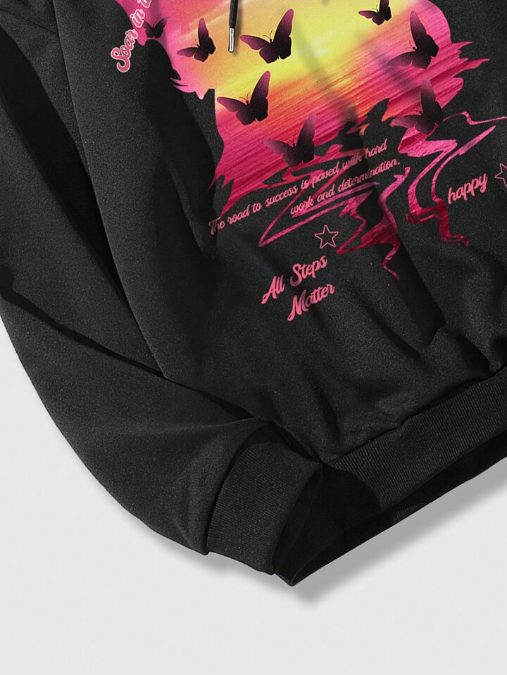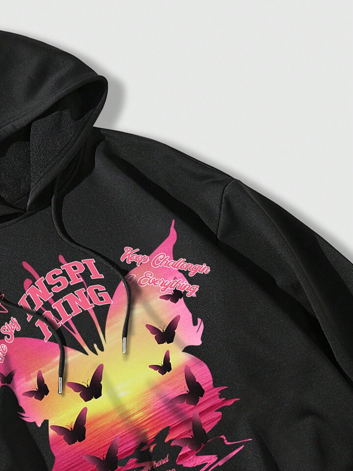 Street Life Men's Drop Shoulder Hoodie With Letter And Butterfly Print And Drawstring