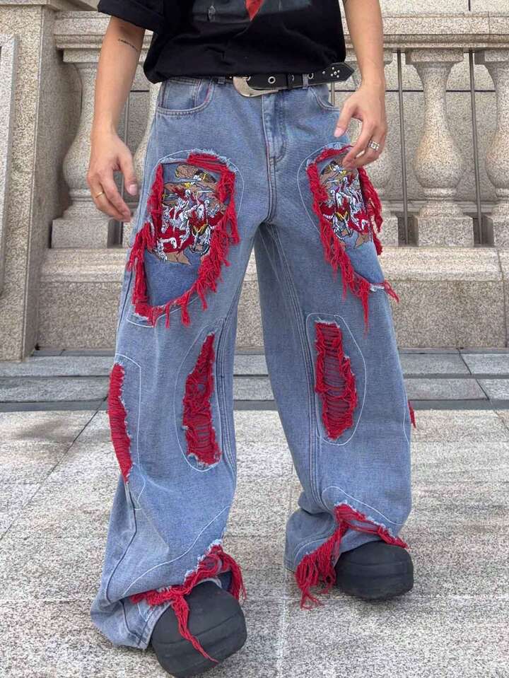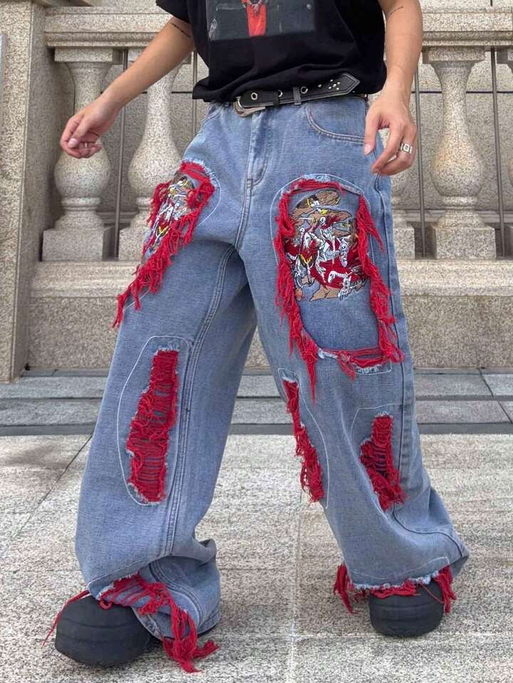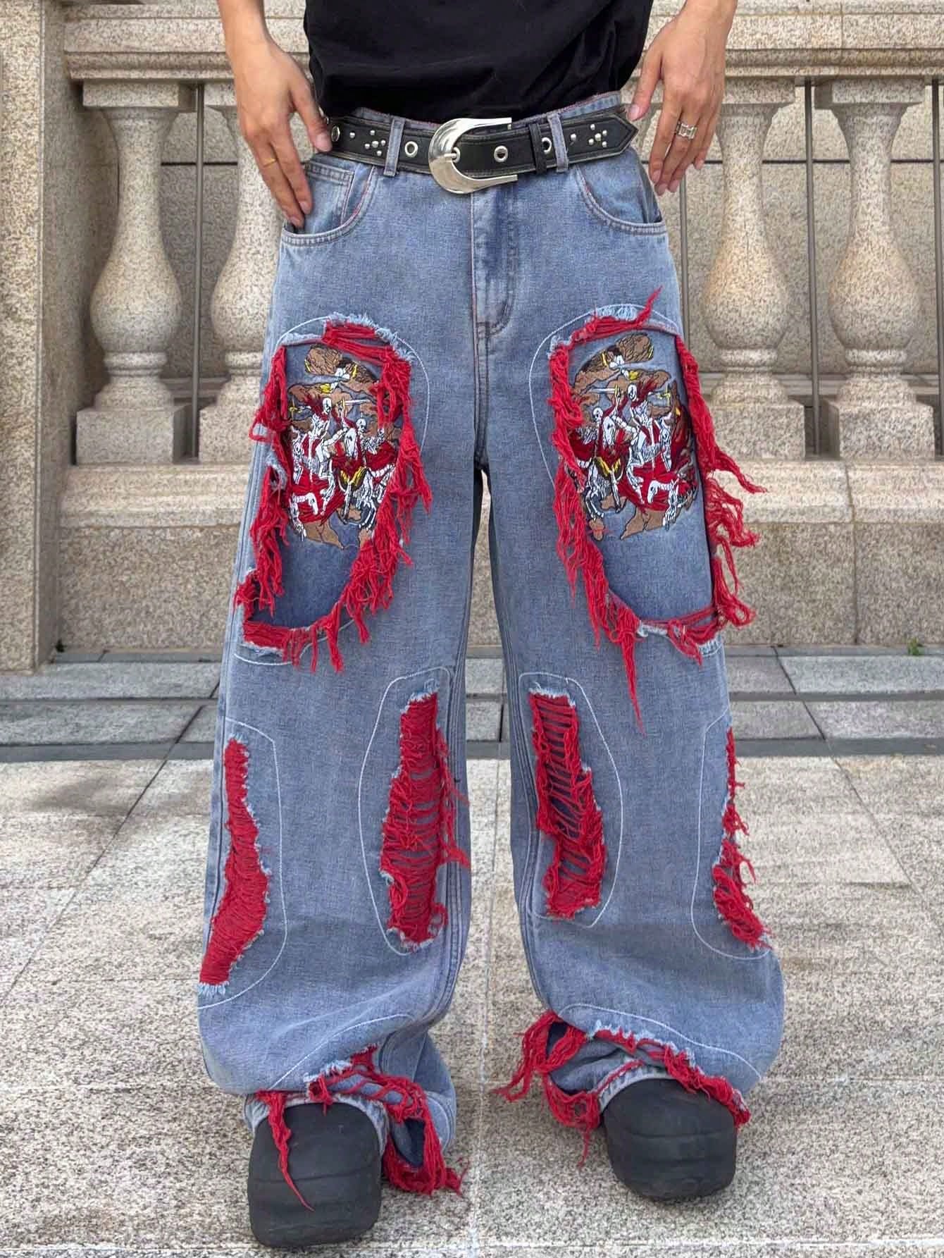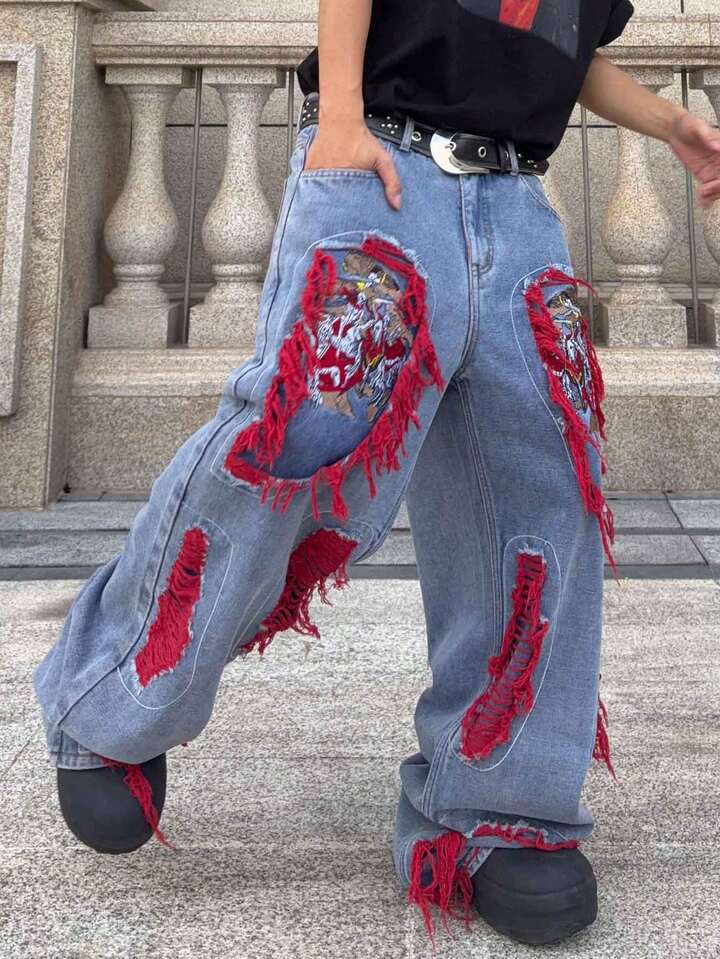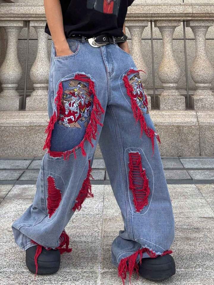 Street Life Men's Embroidered Frayed Pocket Wide Leg Loose Fit Jeans