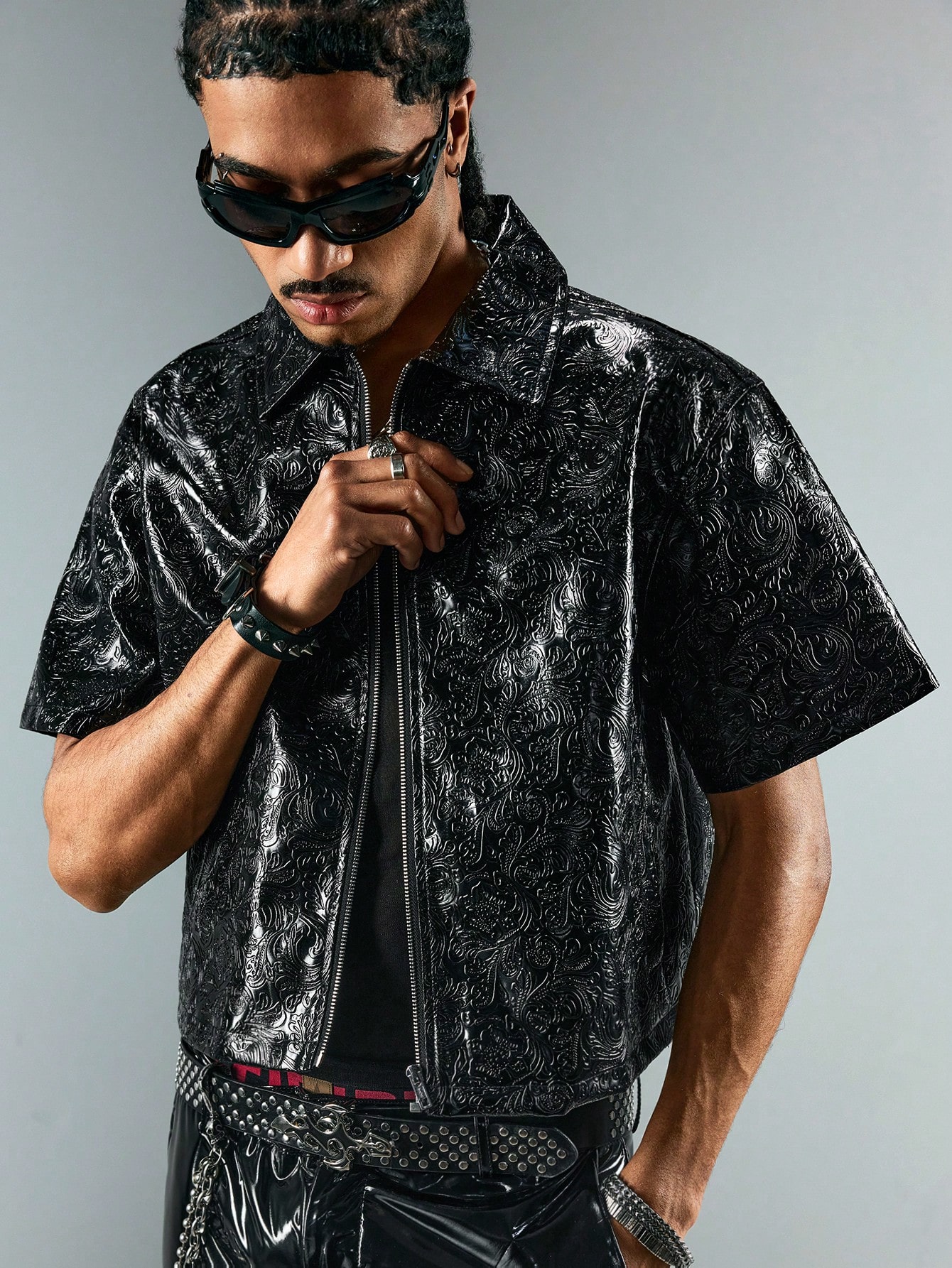 Street Life Men's Fashion PU Texture Zipper Short Sleeve Shirt