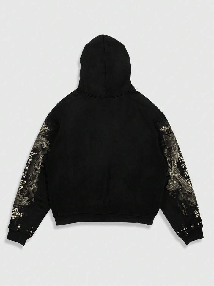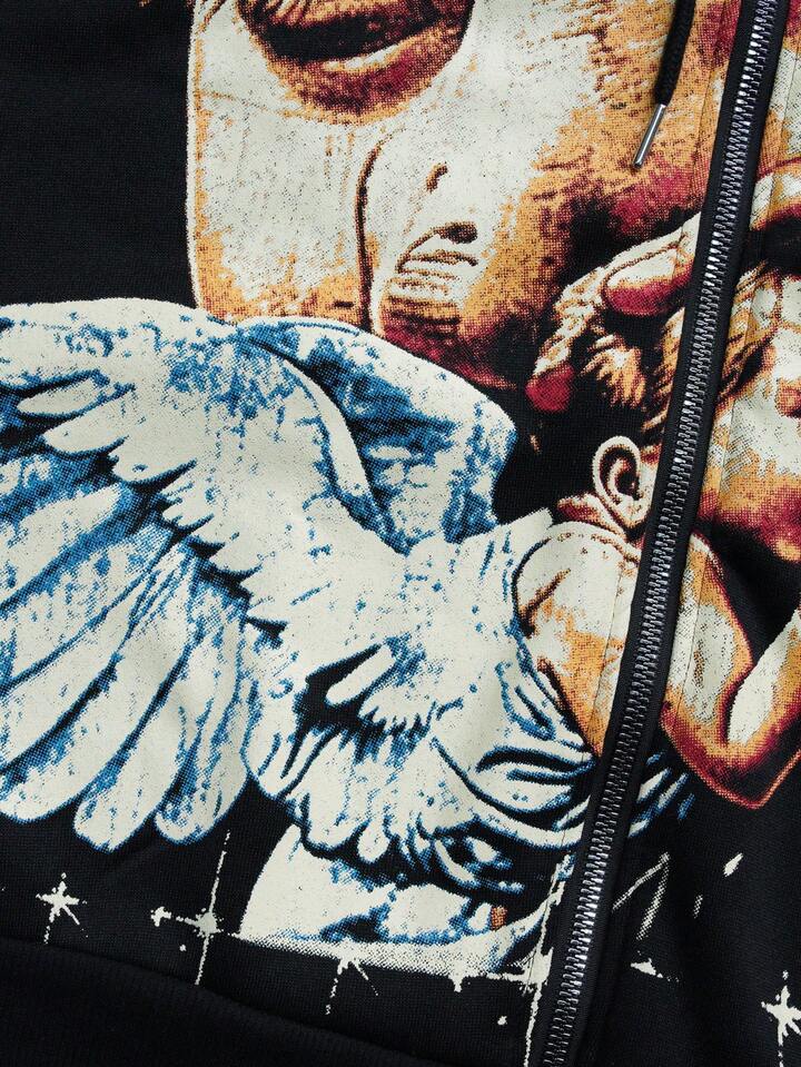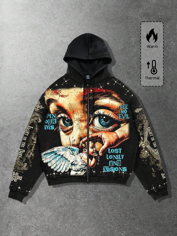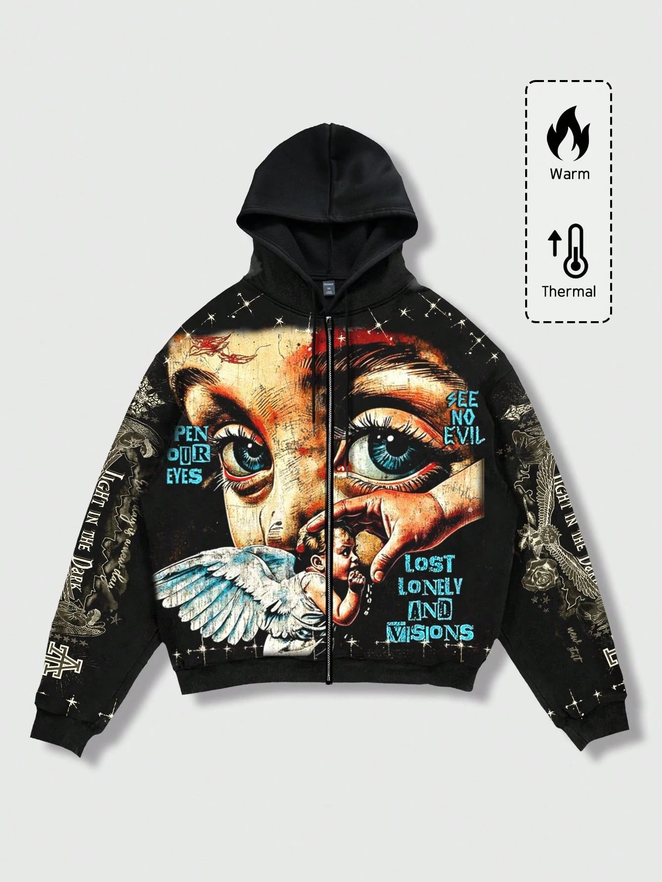 Street Life Men's Fashion Street Angel Print Zip-Up Drawstring Hooded Thermal Lined Sweatshirt, Autumn/Winter