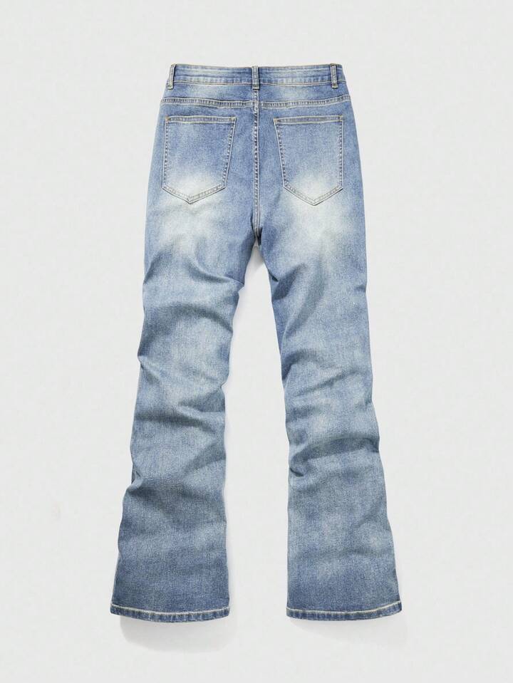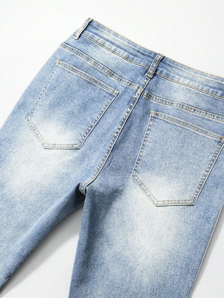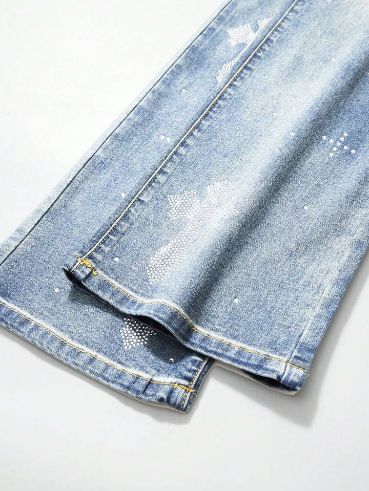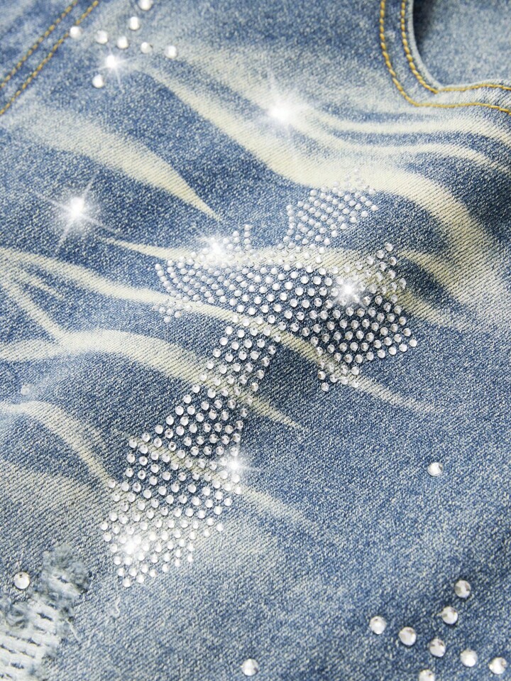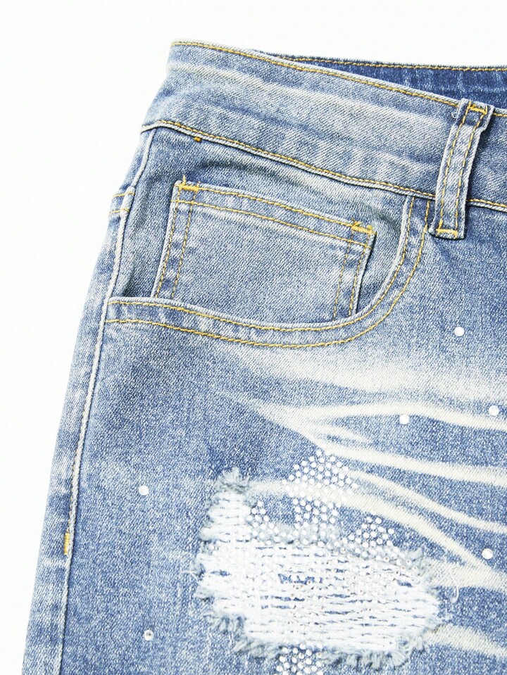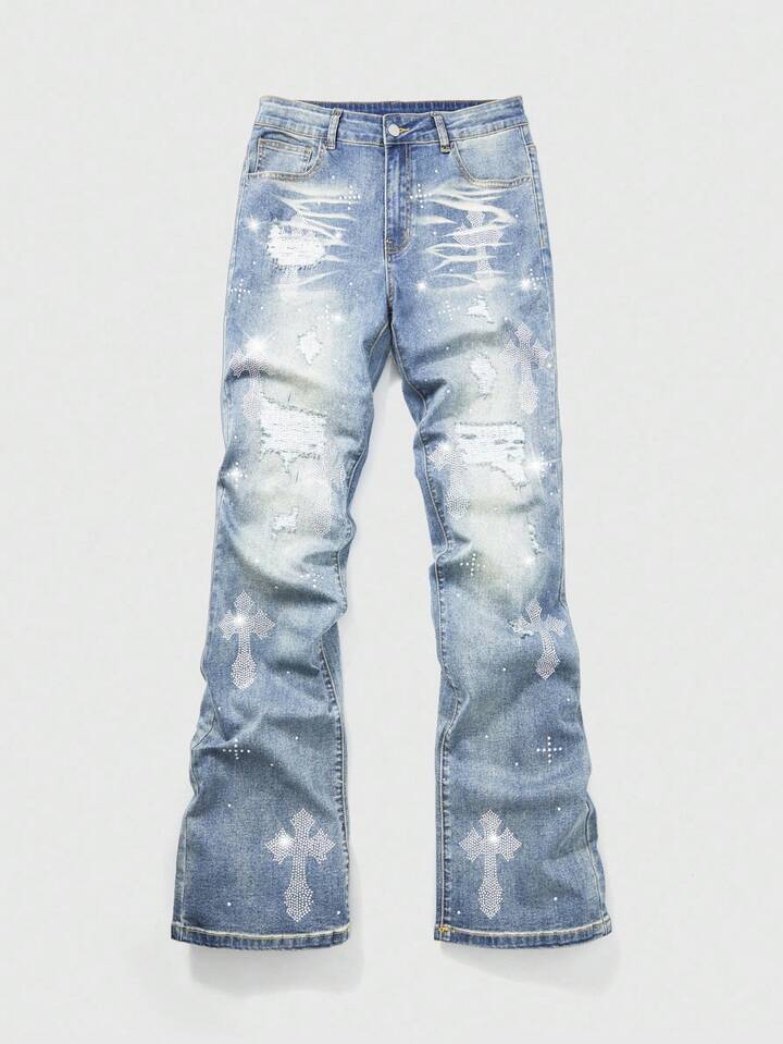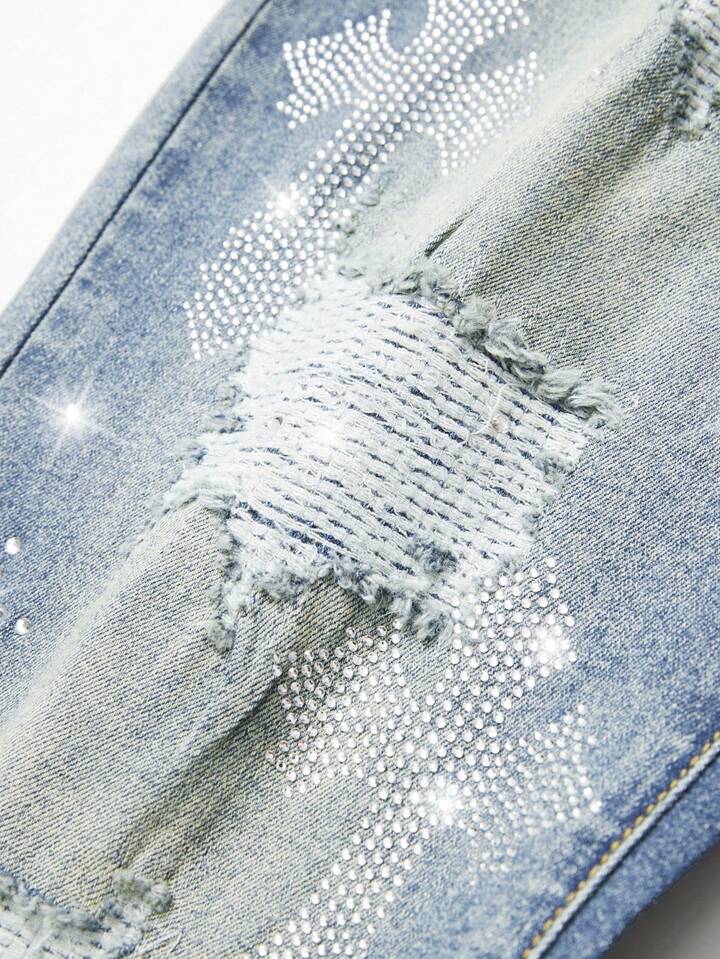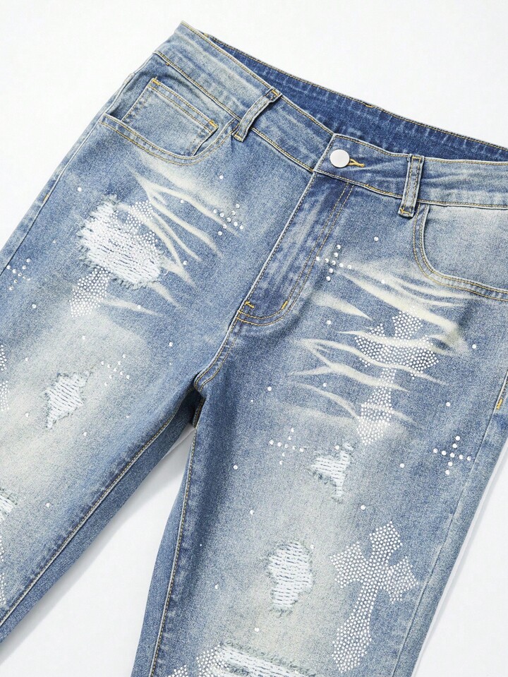 Street Life Men's Fashion Washed Distressed Rhinestone Ripped Jeans