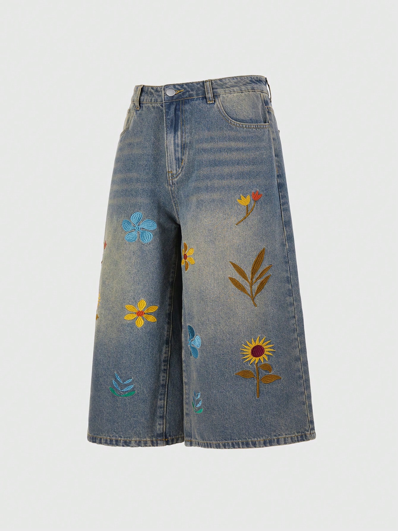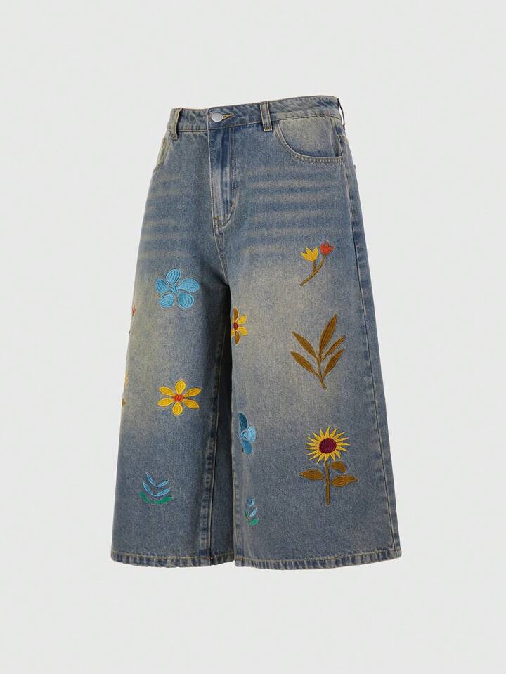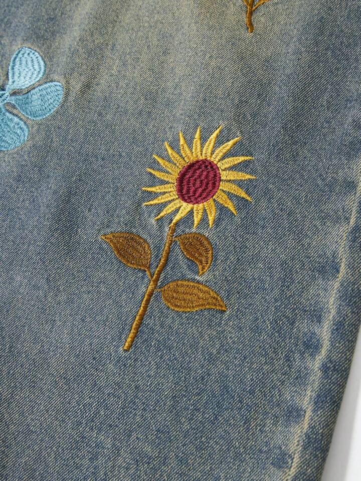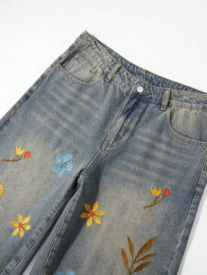Street Life Men's Floral Embroidery Pocket Casual Loose Fit Jeans, Vacation