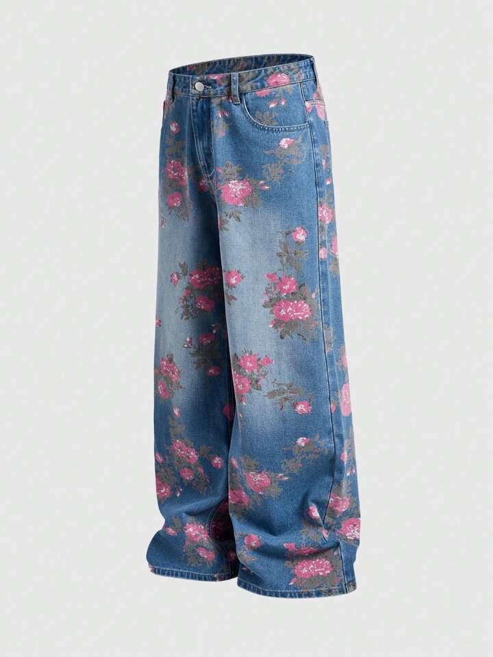 Street Life Men's Floral Pattern Pocket Loose Wide-Leg Casual Jeans