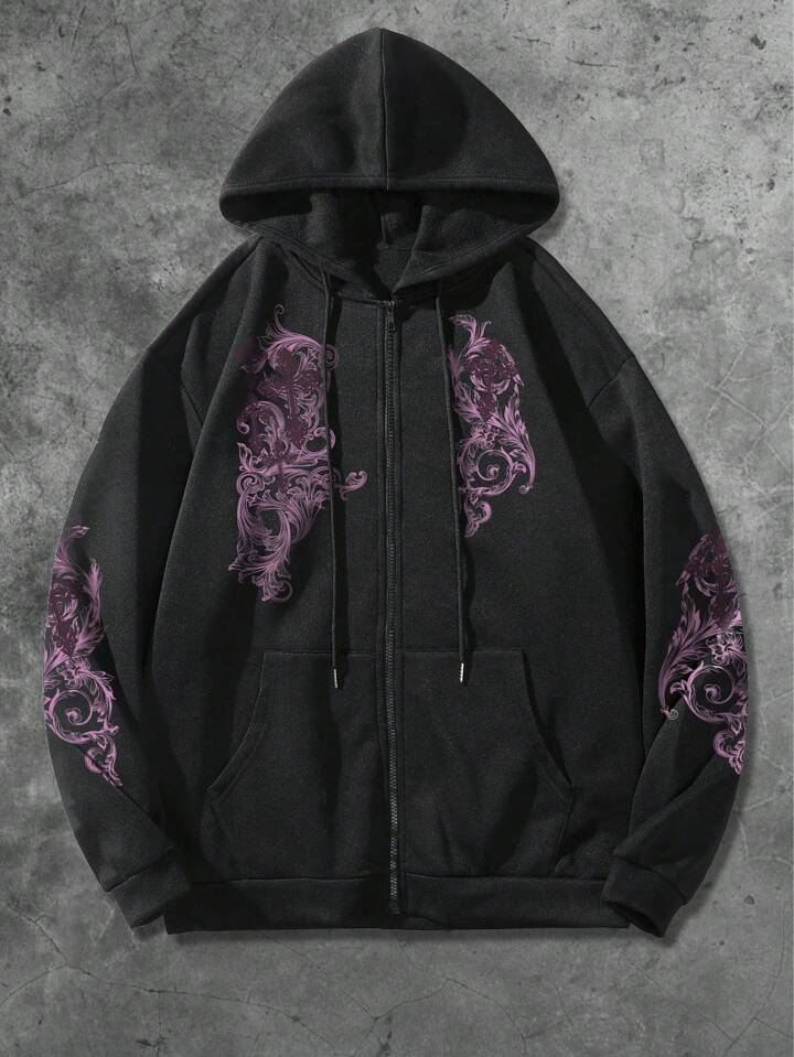 Street Life Men's Floral Print Zip Front Drawstring Hooded Casual Sweatshirt , Fall Winter