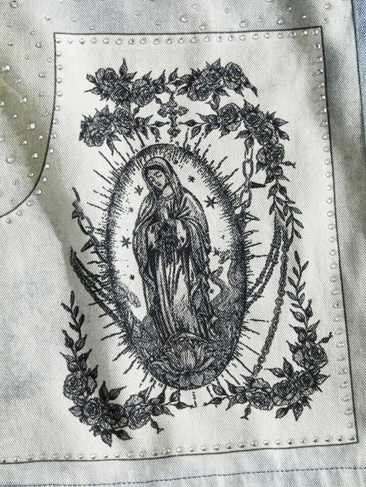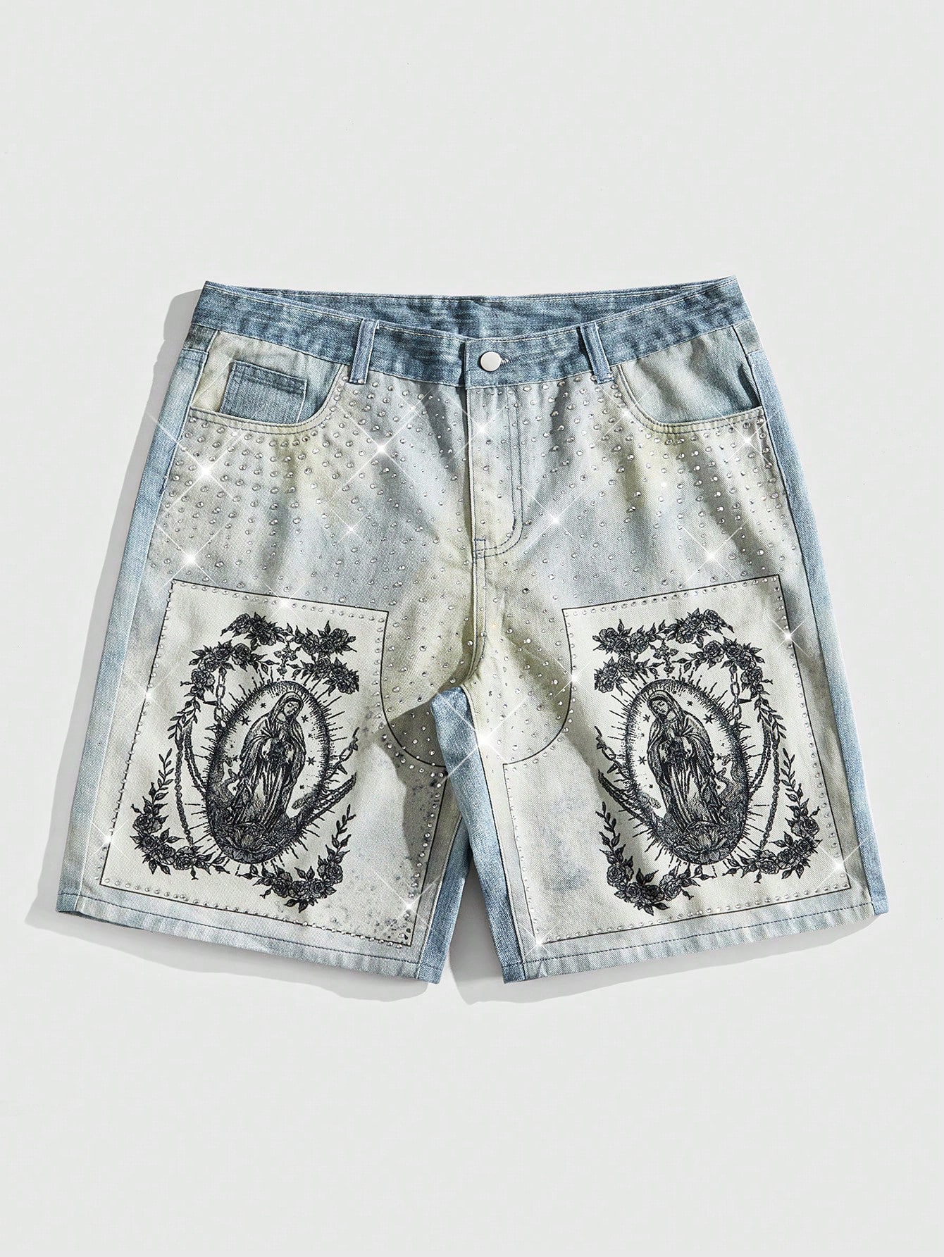 Street Life Men's Goth Virgin Mary Fashion Digital Printed Denim Shorts, Halloween