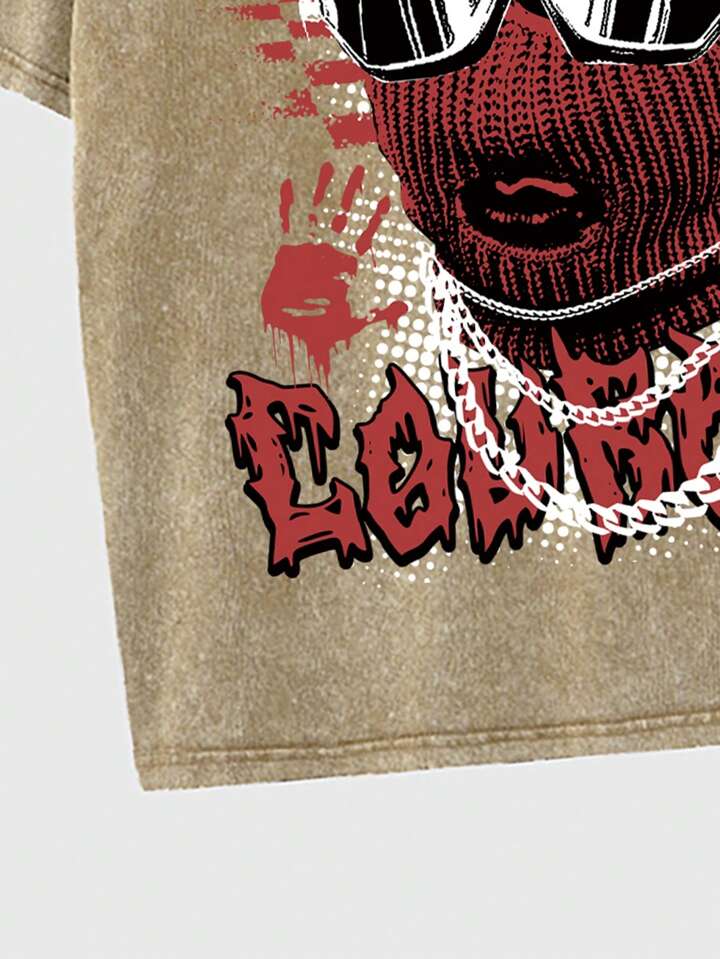 Street Life Men's Hat Character Head Print Distressed Washed T-Shirt, Spring/Summer, Short Sleeve, High Street Vintage, School