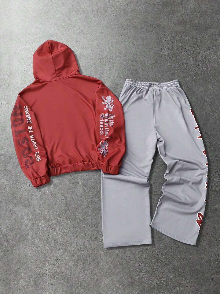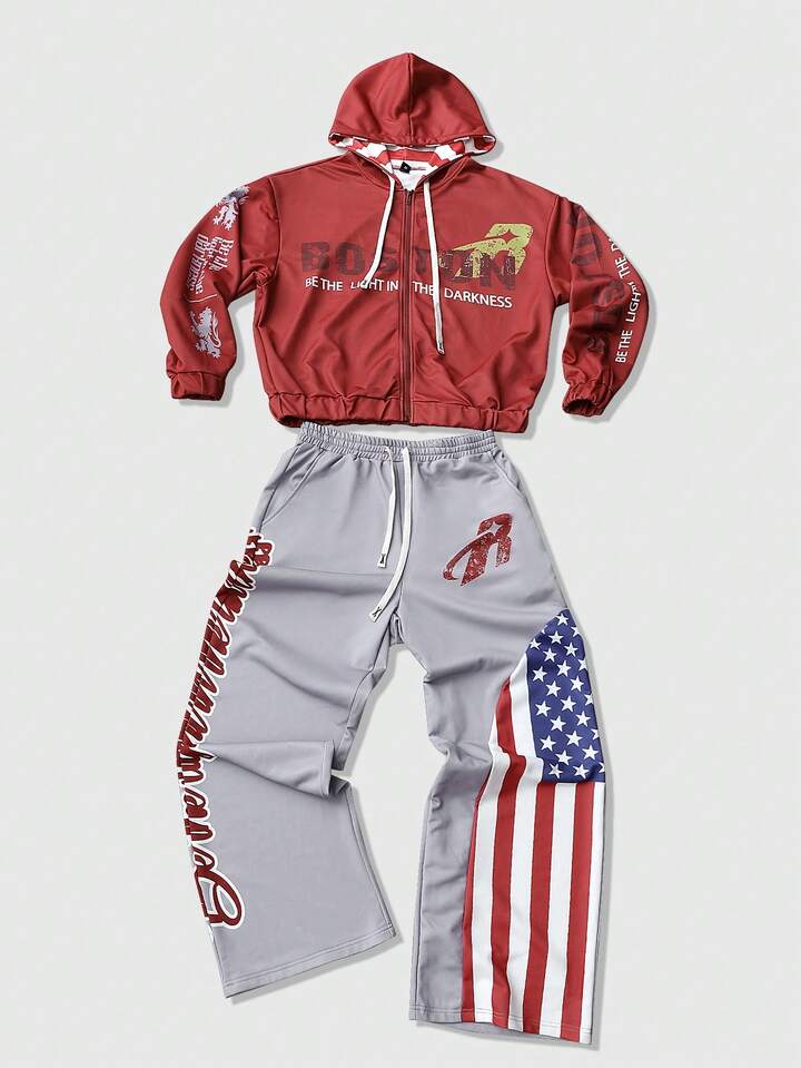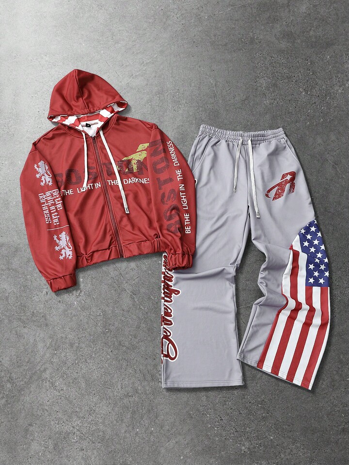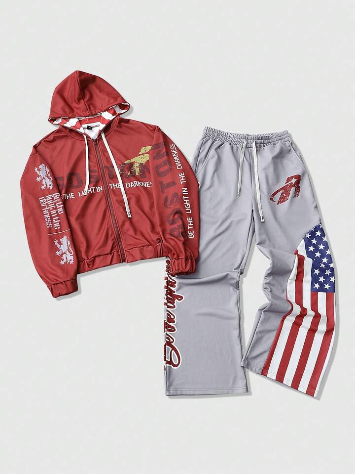 Street Life Men's Hooded Sweatshirt Set, Autumn/Winter Street American English Graphic Print Zip-Up Hoodie Set, Unisex