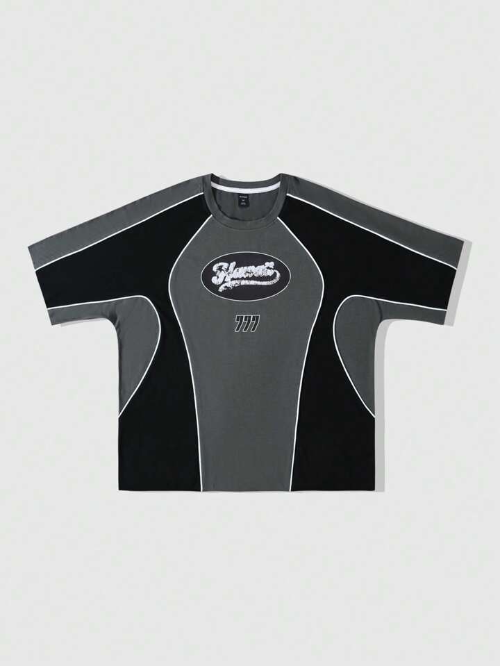 Street Life Men's Jersey Letter Print Round Neck Short Sleeve Casual Contrast Color T-Shirt, Loose & Cropped