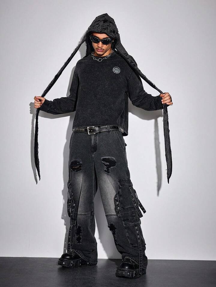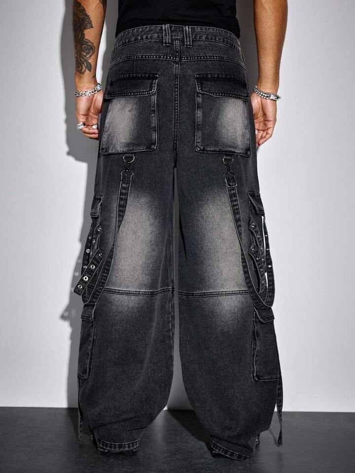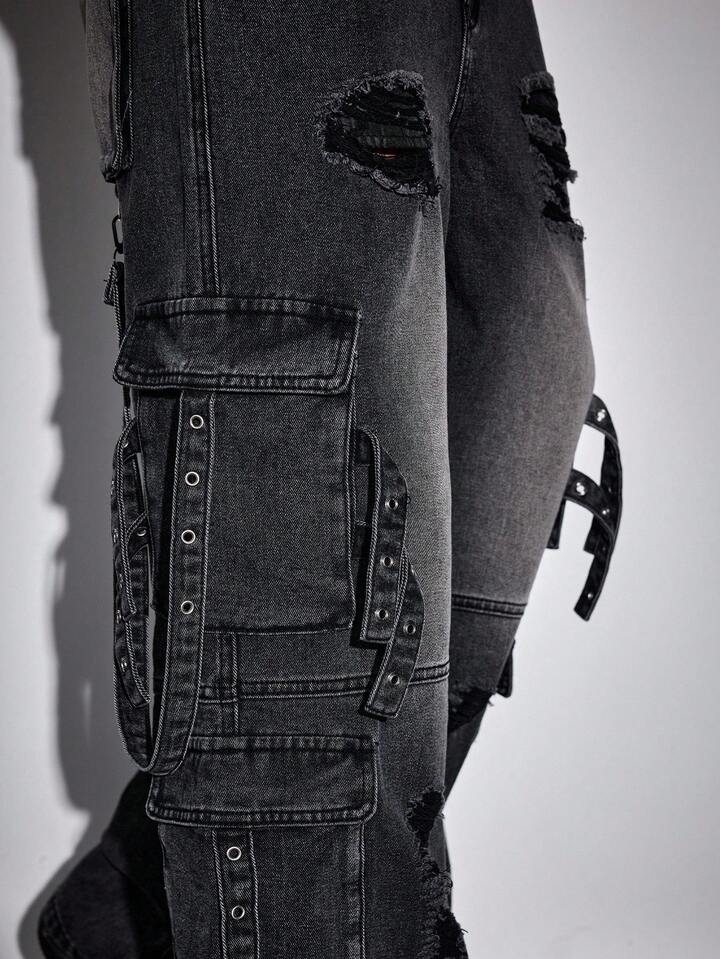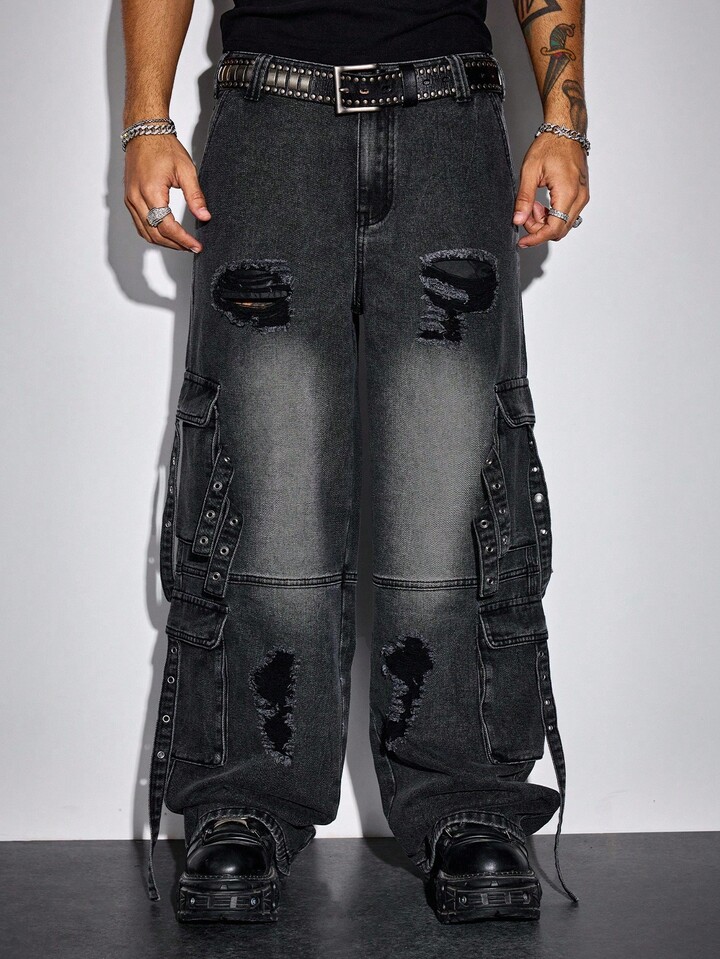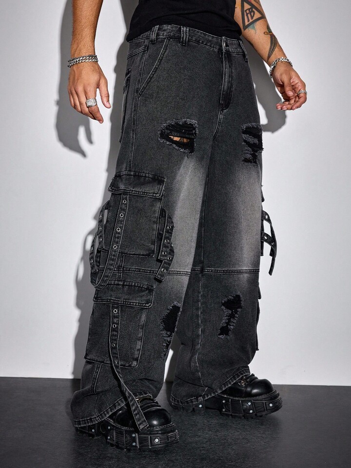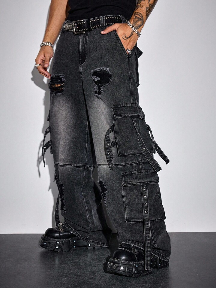 Street Life Men's KPOP Casual Everyday Washed Punk Distressed Cargo Jeans