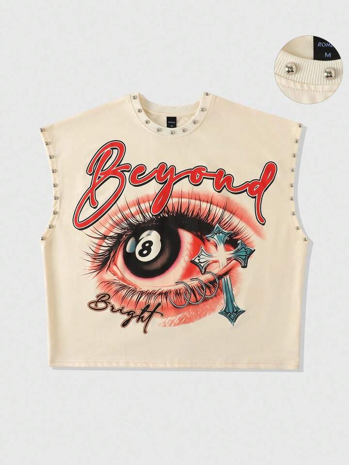 Street Life Men's Letter & Eye Print Rivet Decor Loose Fit Tank Top