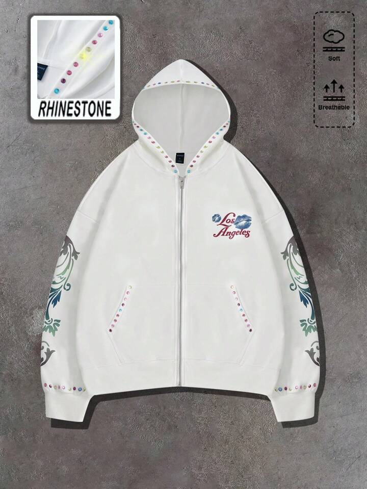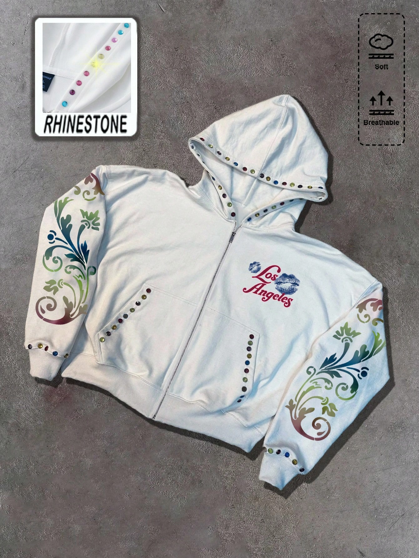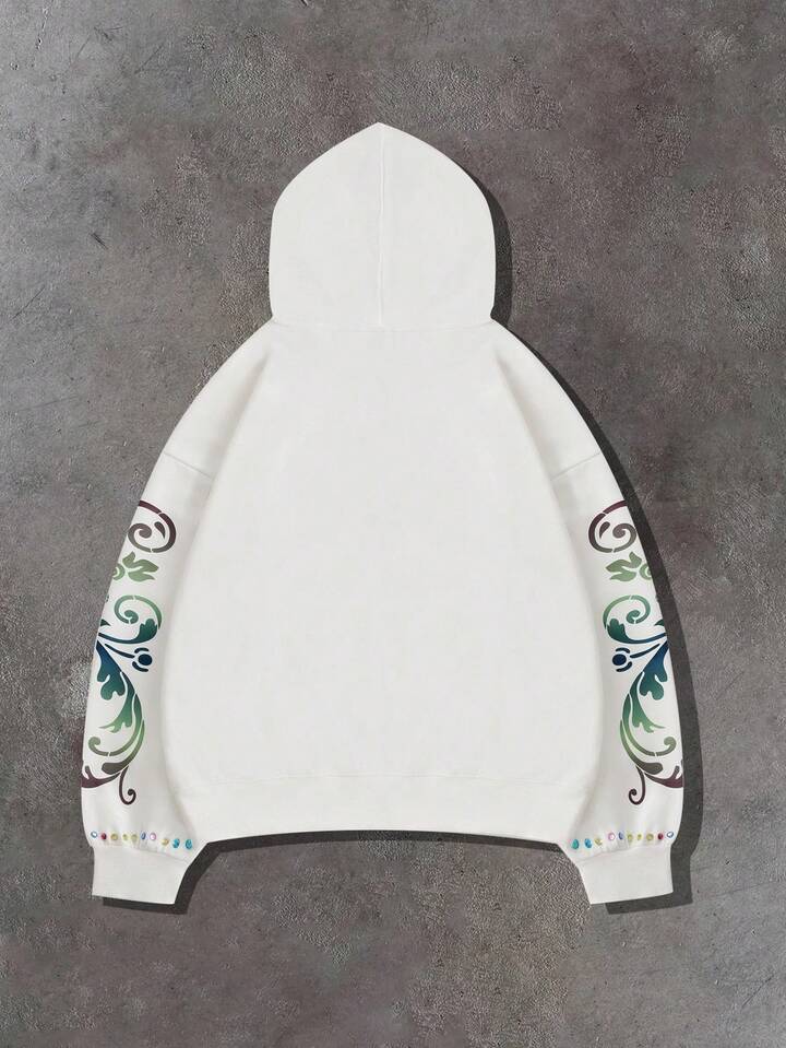 Street Life Men's Letter & Floral Print Rhinestone Hooded Sweatshirt