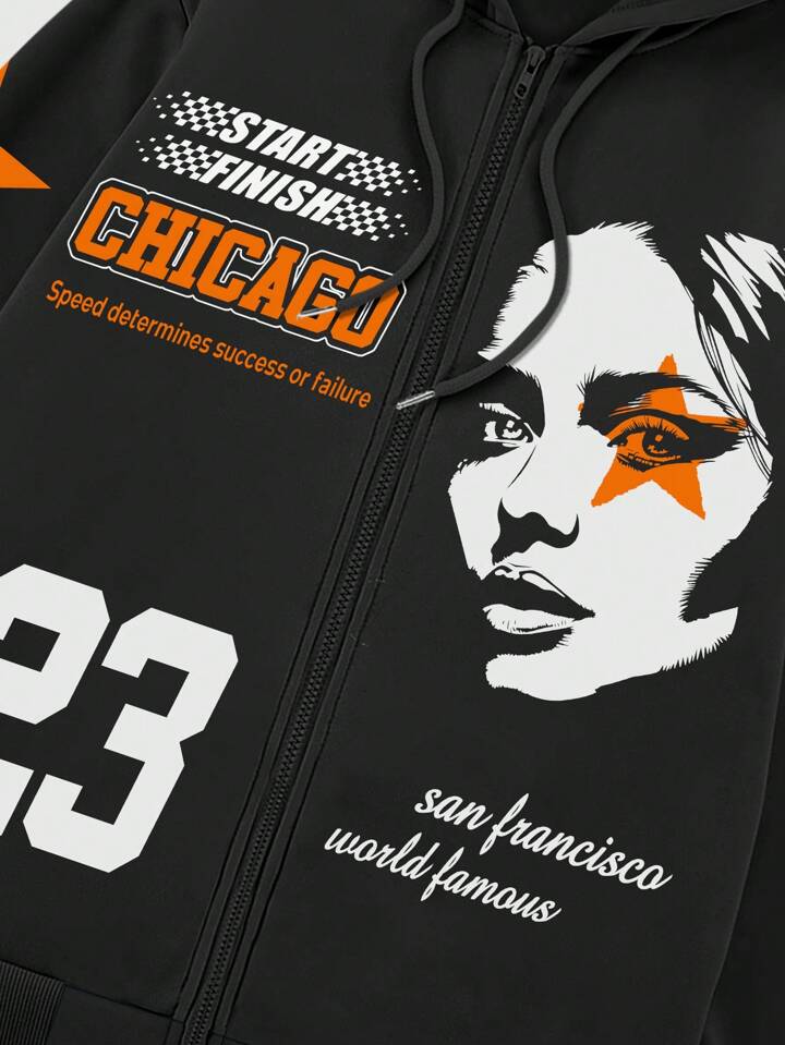 Street Life Men's Letter & Portrait Print Zip-Up Hooded Sweatshirt Sweatshirt