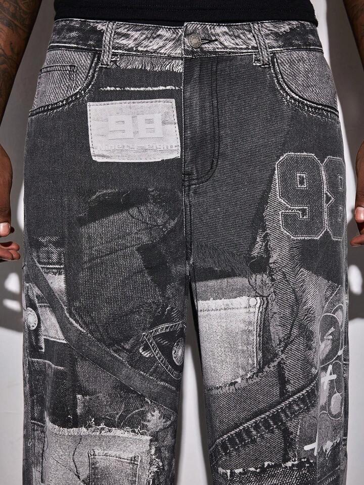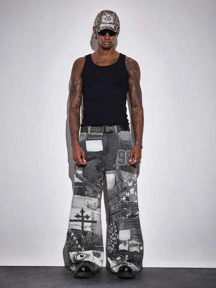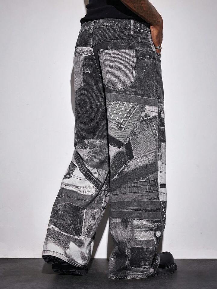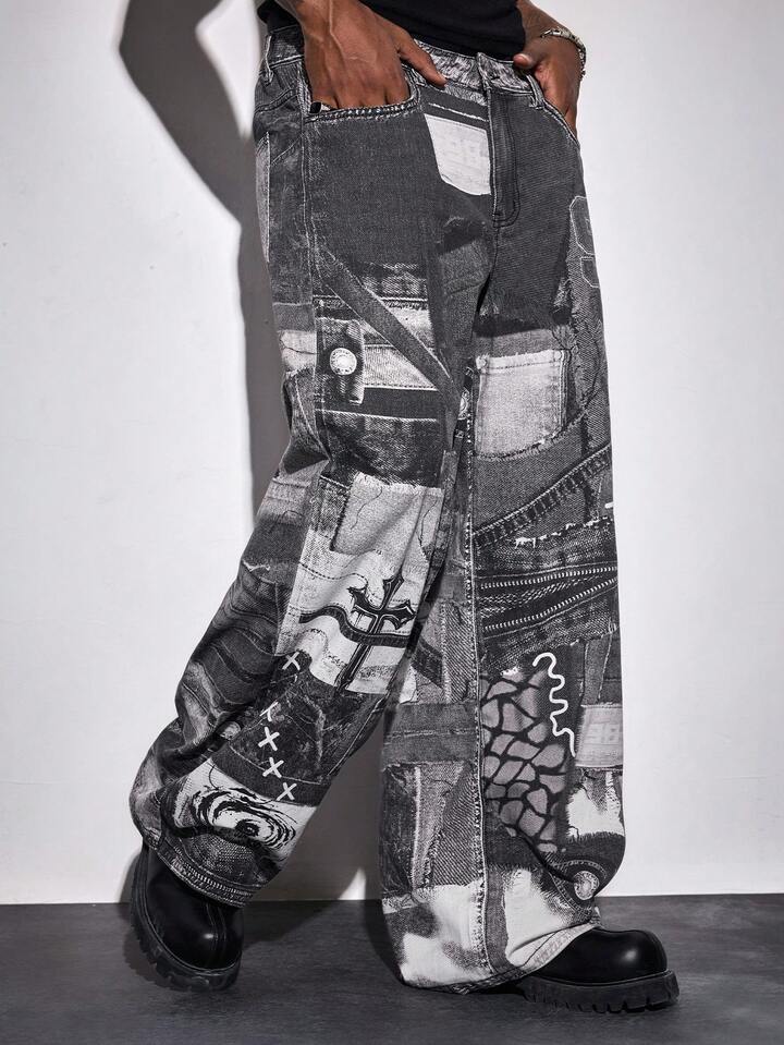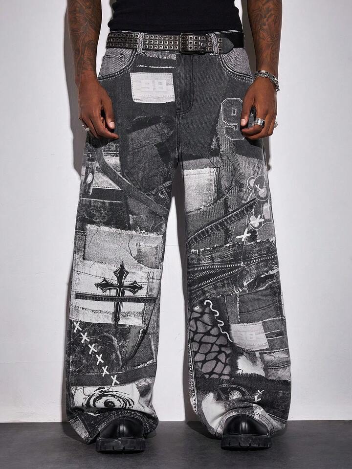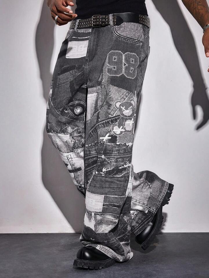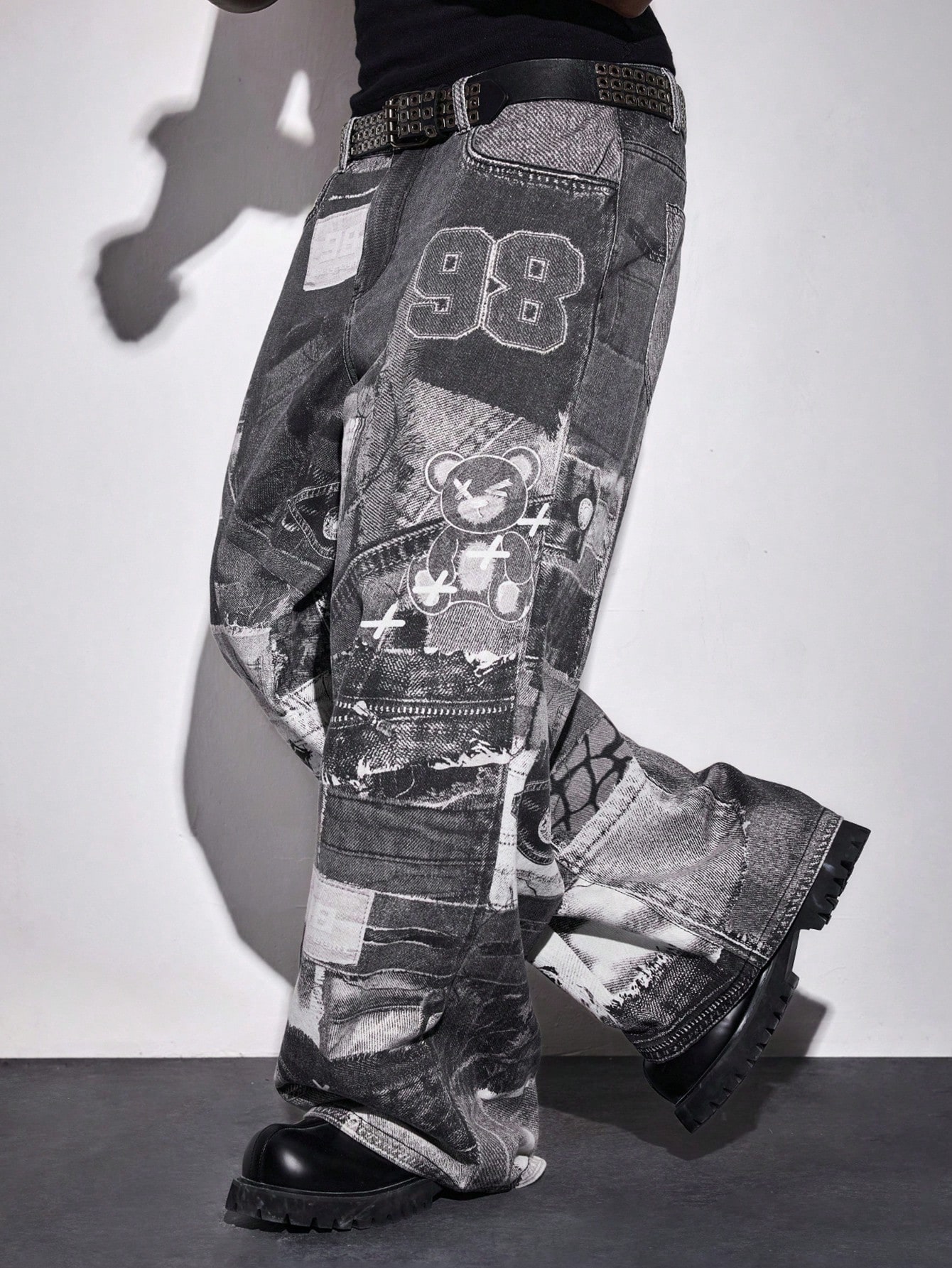 Street Life Men's Loose Fit Cartoon Bear Graphic Pocket Wide Leg Casual Jeans