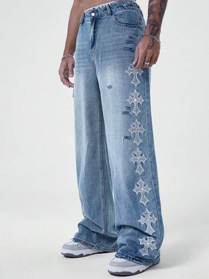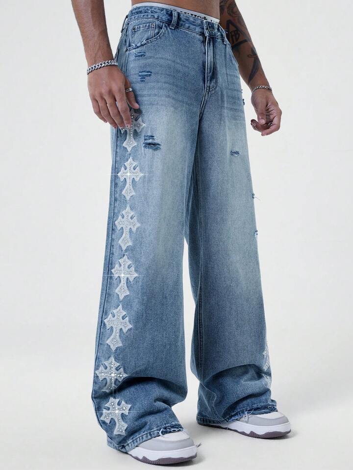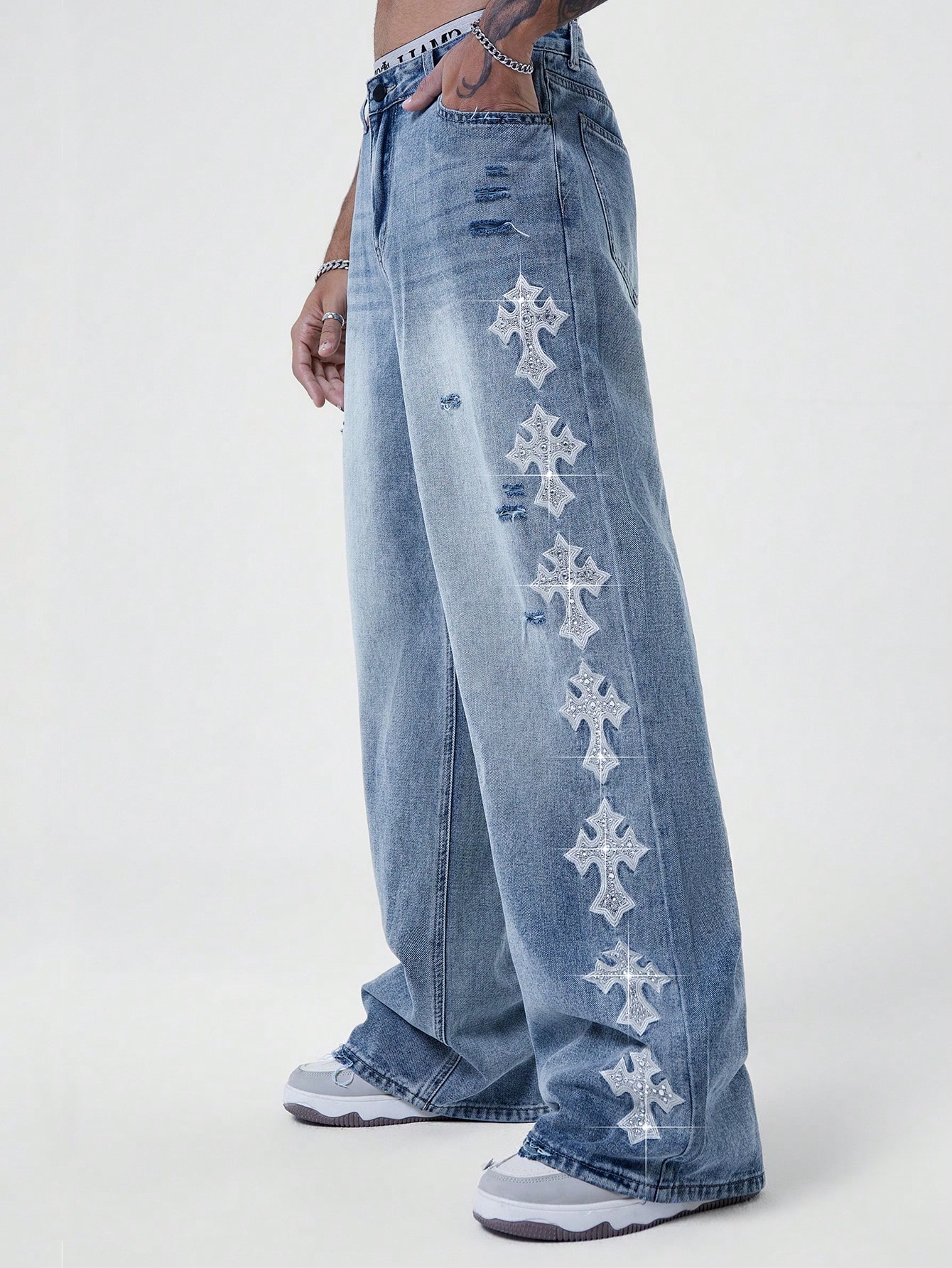 Street Life Men's Loose Fit Cross Rhinestone Decor Denim Jeans