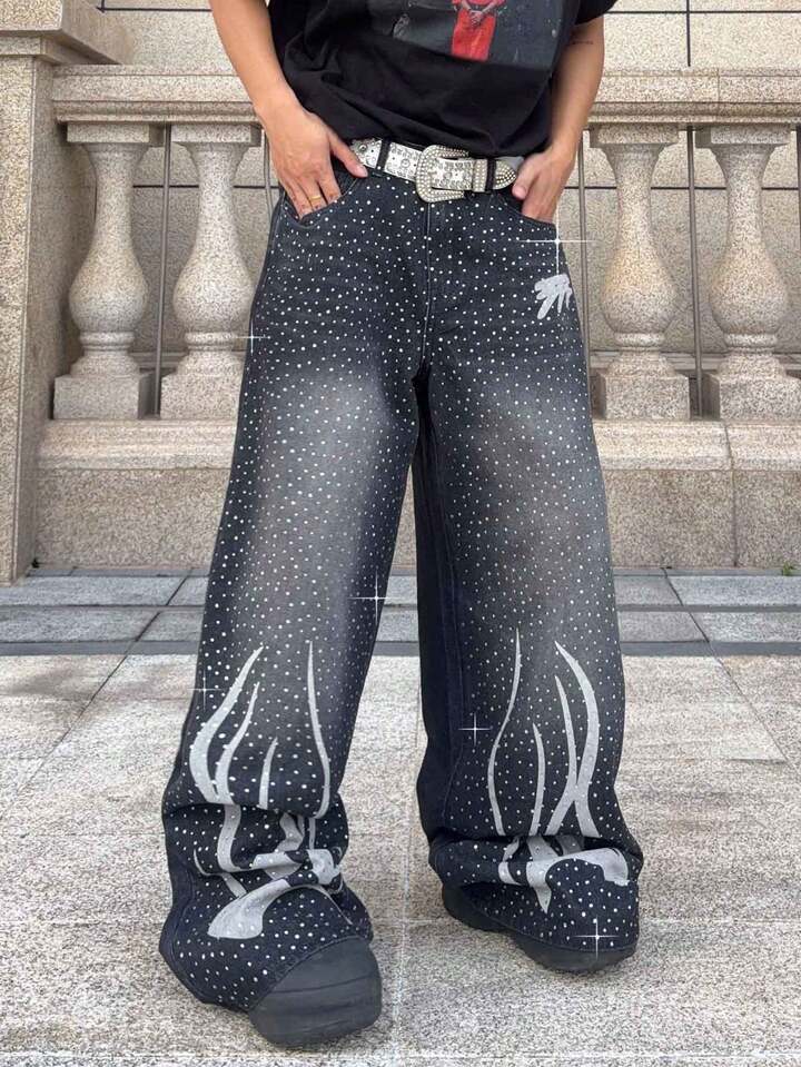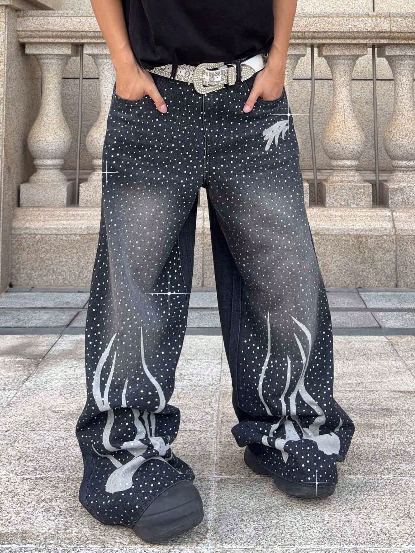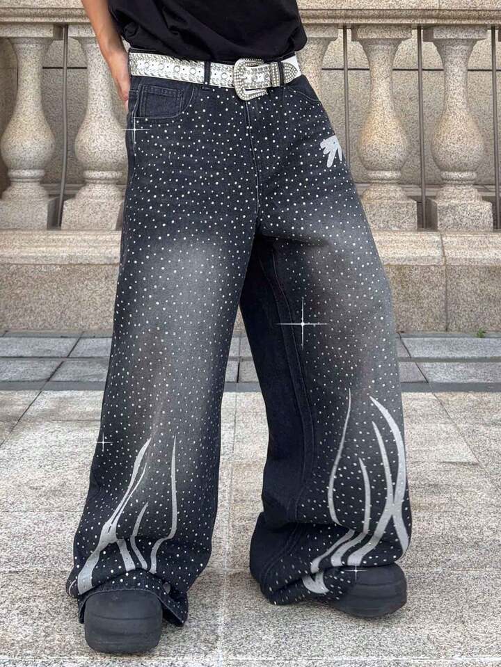 Street Life Men's Loose Fit Rhinestone Embellished Wide Leg Jeans