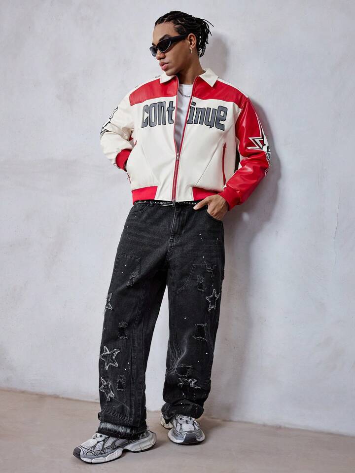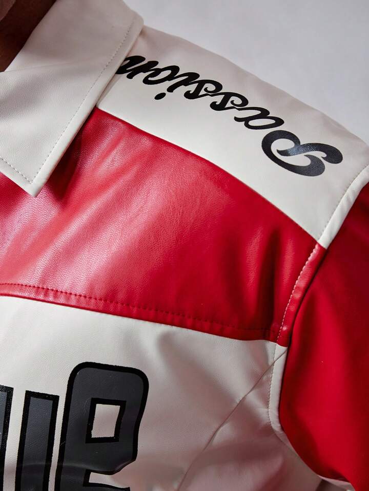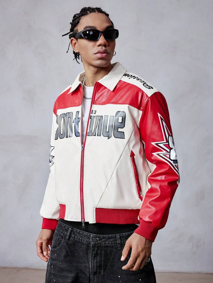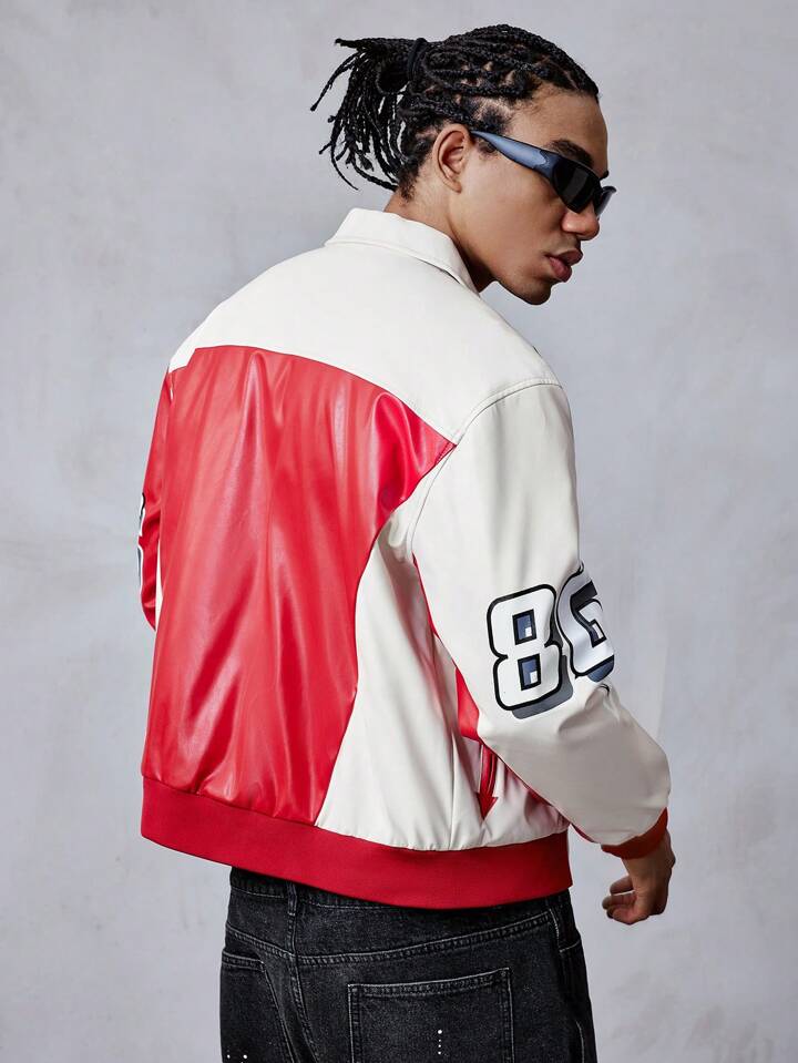 Street Life Men's Loose Pu Color Block Zip Up Sports Jacket