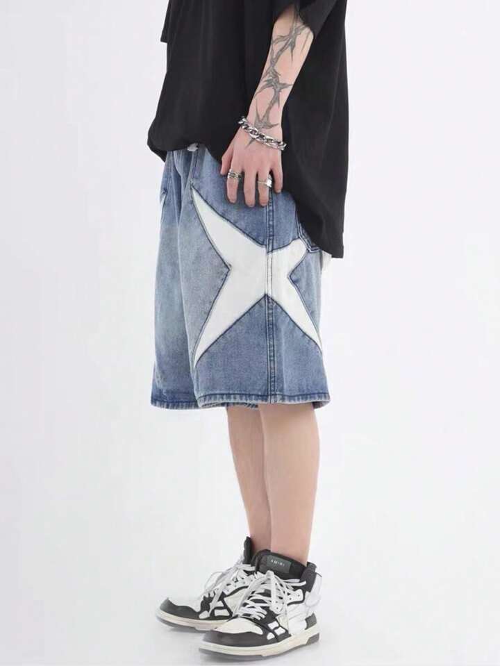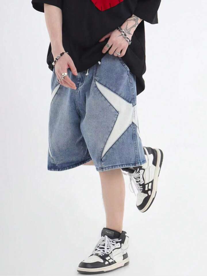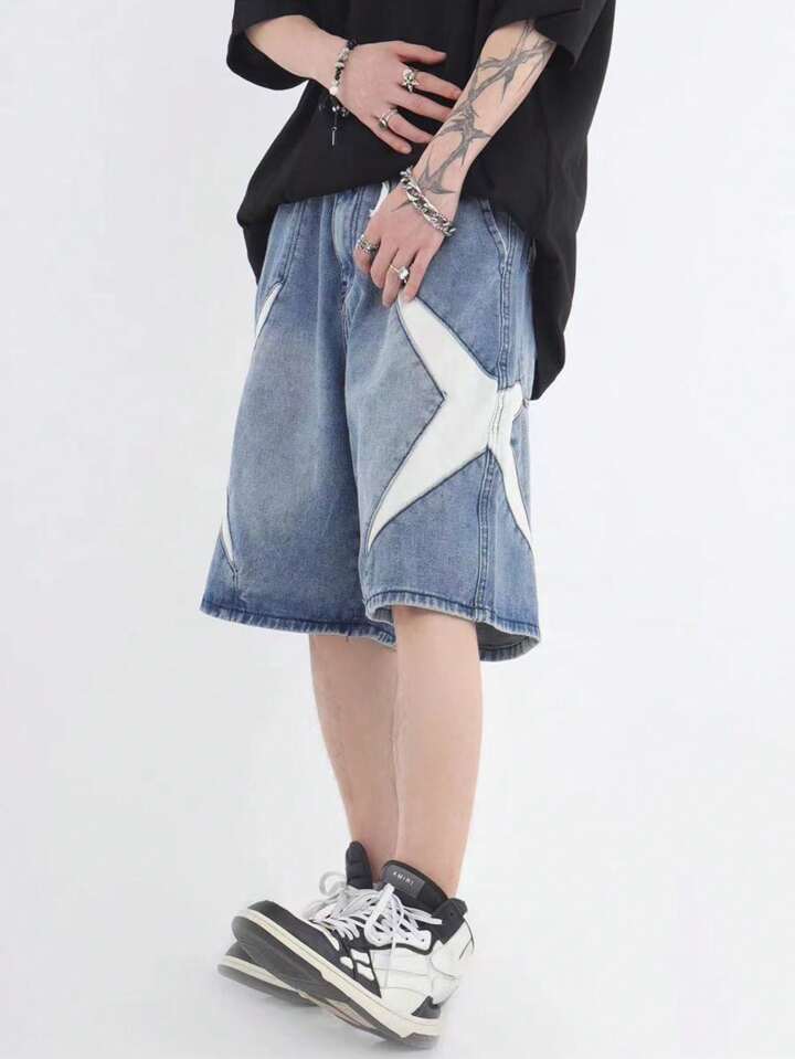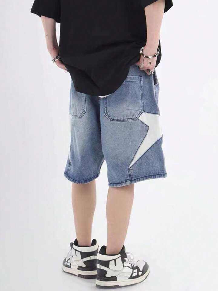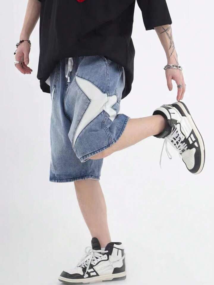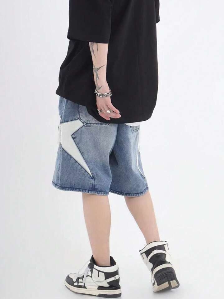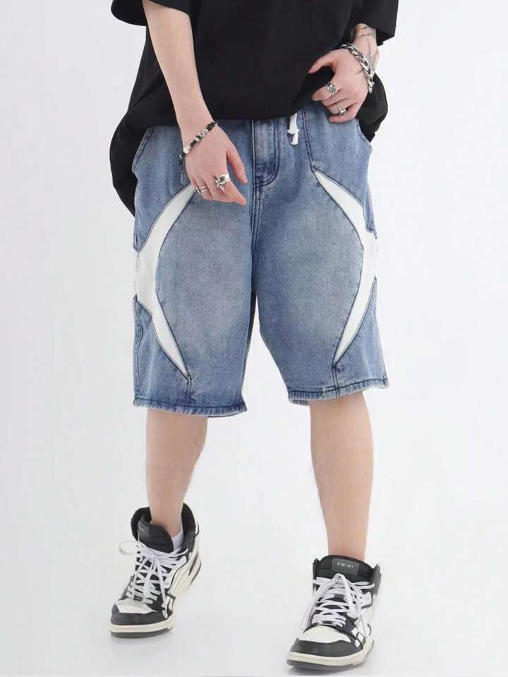 Street Life Men's Patchwork Denim Shorts, Suitable For Daily Wear In Spring And Summer
