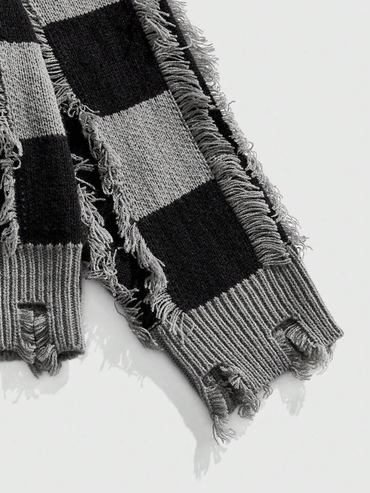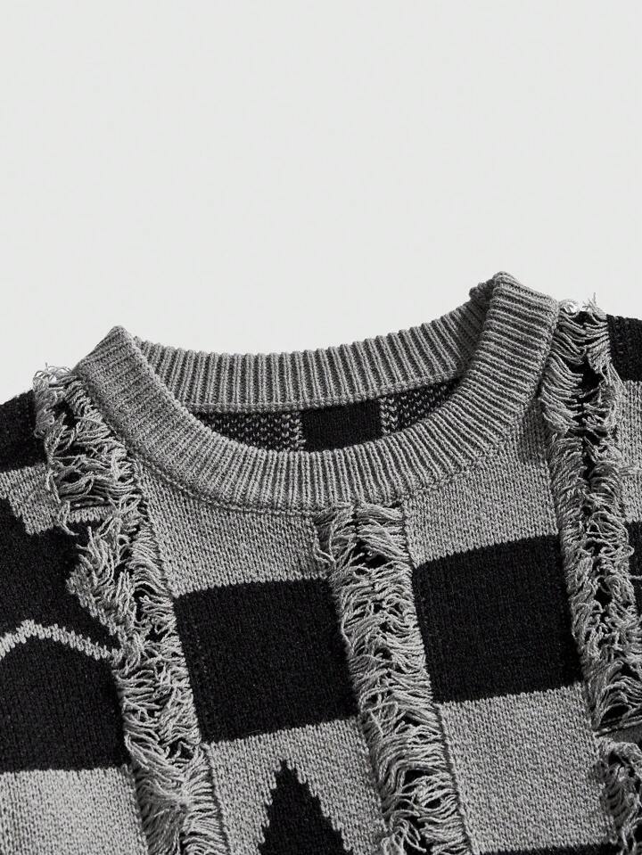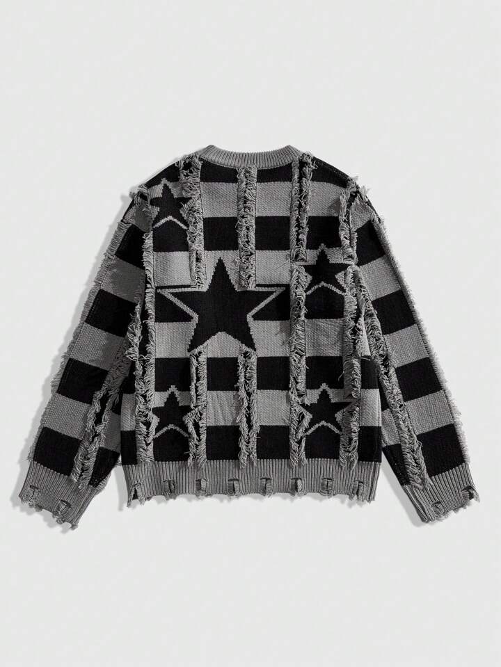 Street Life Men's Pattern Jacquard Frayed Edge Distressed Round Neck Long Sleeve Casual Pullover Top, Suitable For Daily Wear