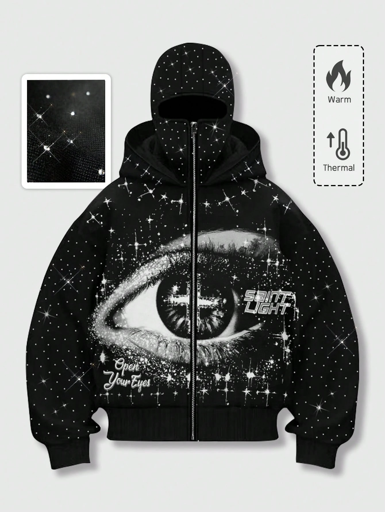 Street Life Men's Punk Street Style Graphic Print Rhinestone Embellished Zip-Up Hooded Sweatshirt, Autumn/Winter, Long Sleeve Top