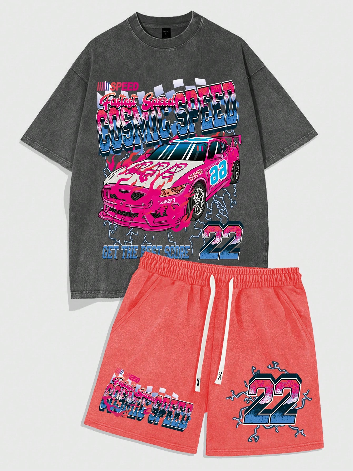 Street Life Men's Racing & Street Graphic Print Washed Short Sleeve T-Shirt Set, High Street Vintage Style