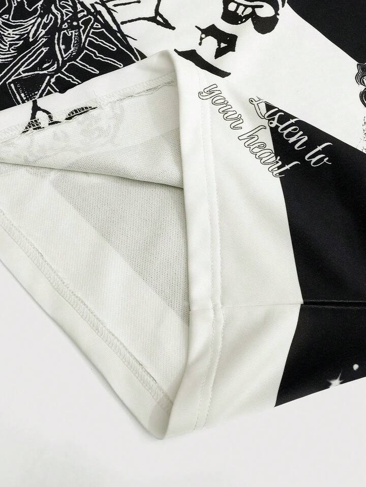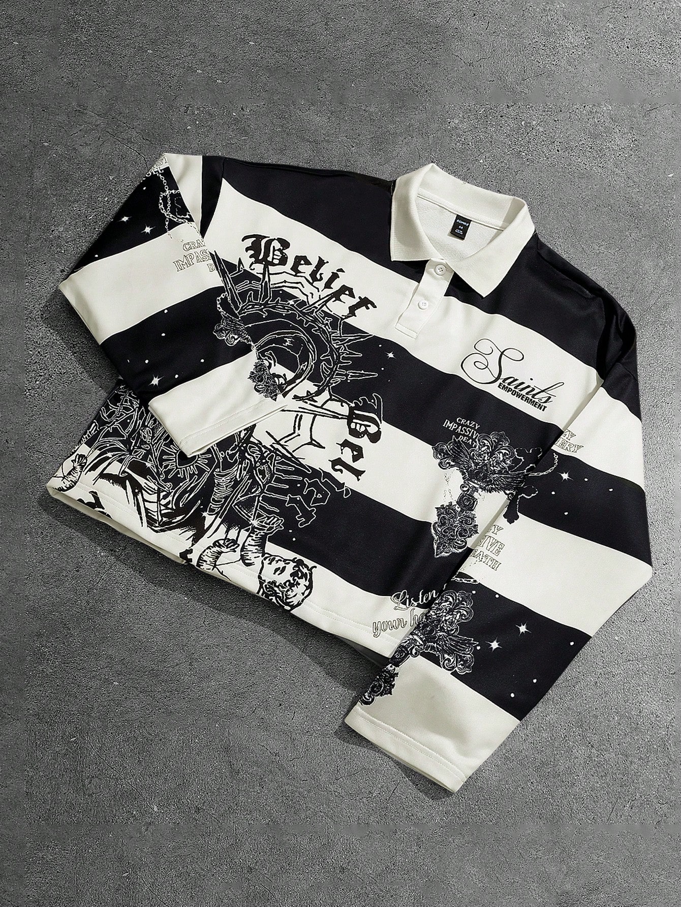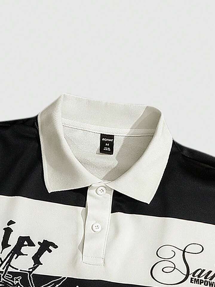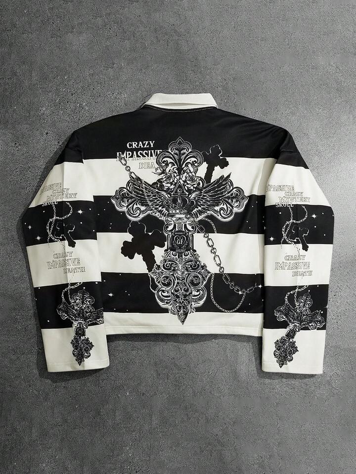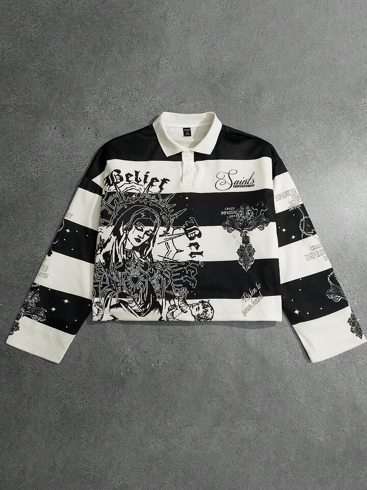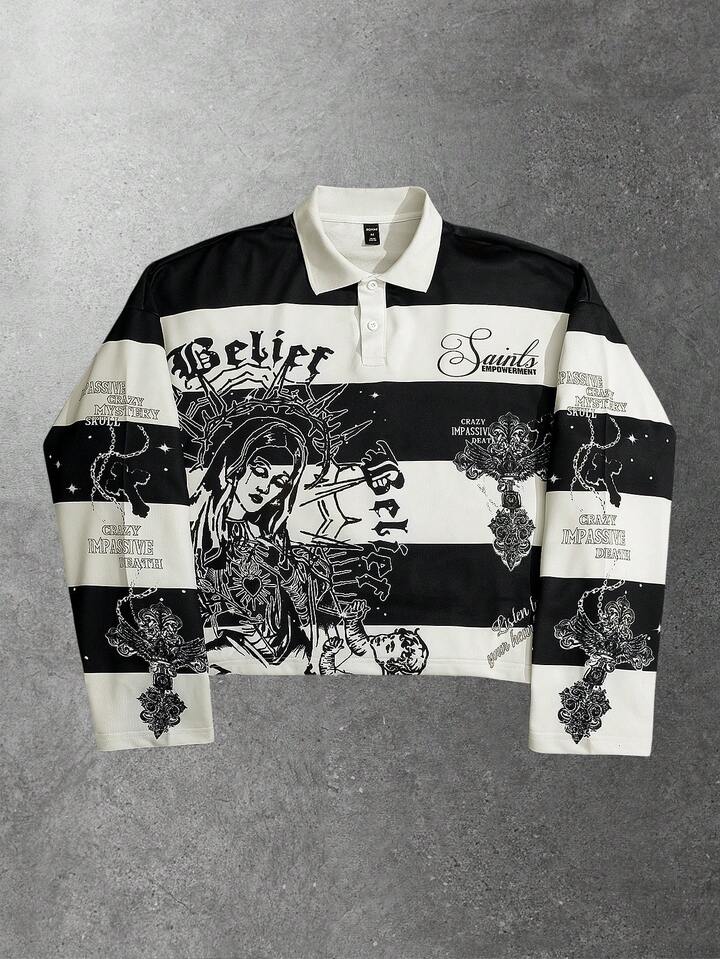 Street Life Men's Retro Virgin Mary Striped English Graphic Print Street American Style Polo Sweatshirt