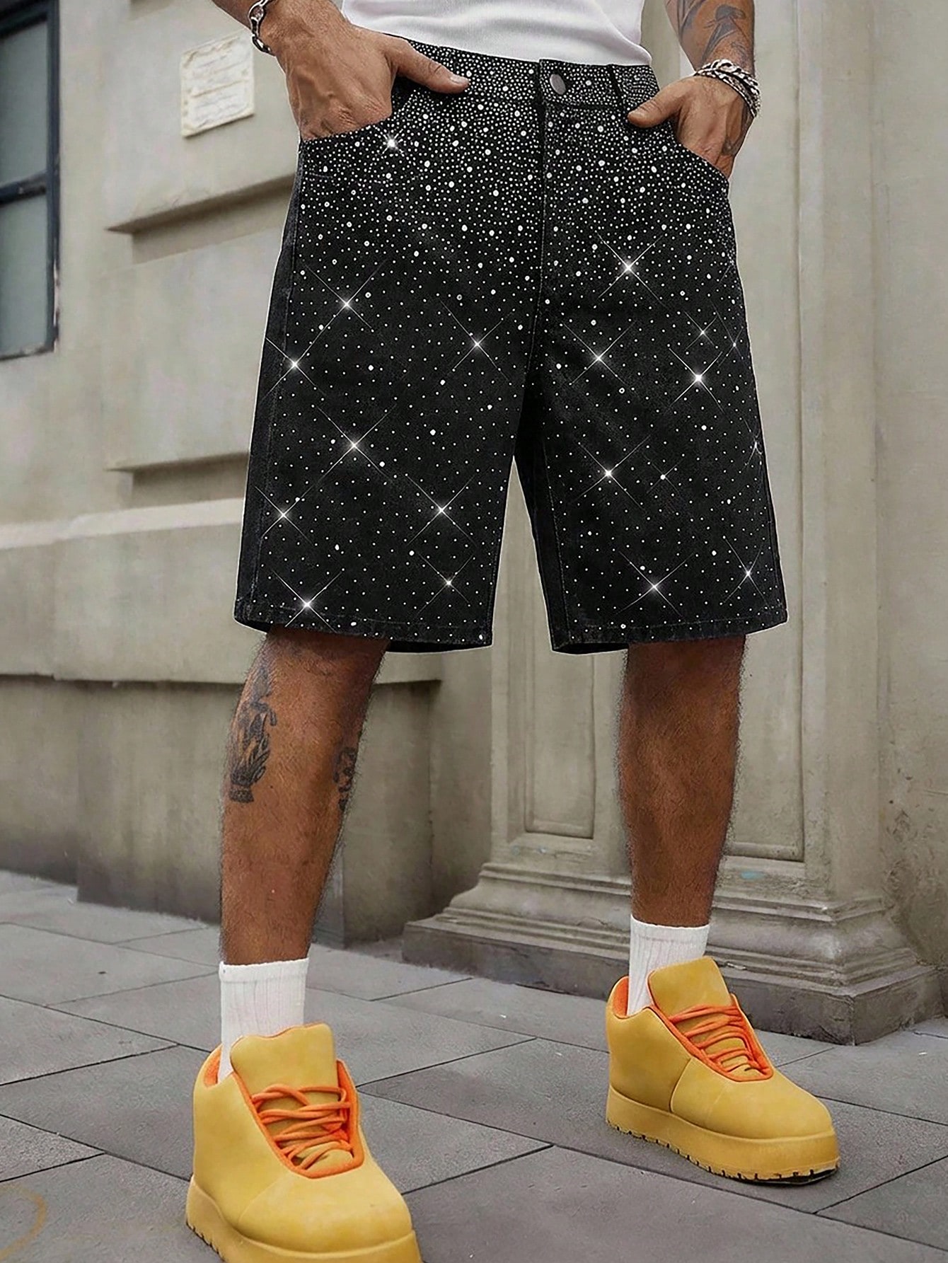 Street Life Men's Rhinestone Embellished Denim Shorts, Suitable For Spring/Summer Everyday Wear