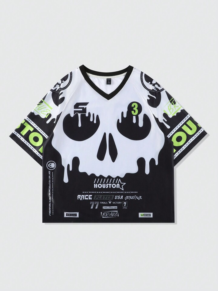 Street Life Men's Skeleton V-Neck Short Sleeve Printed Casual Football Jersey Style T-Shirt, For Everyday Wear