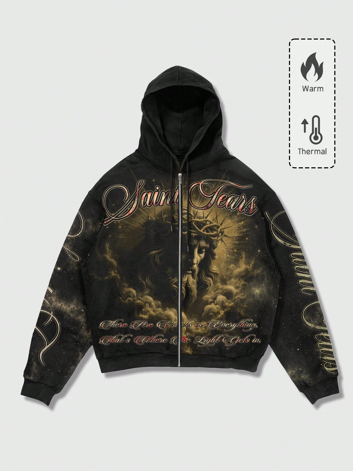 Street Life Men's Street Slogan Print Zip Front Drawstring Hoodie Sweatshirt