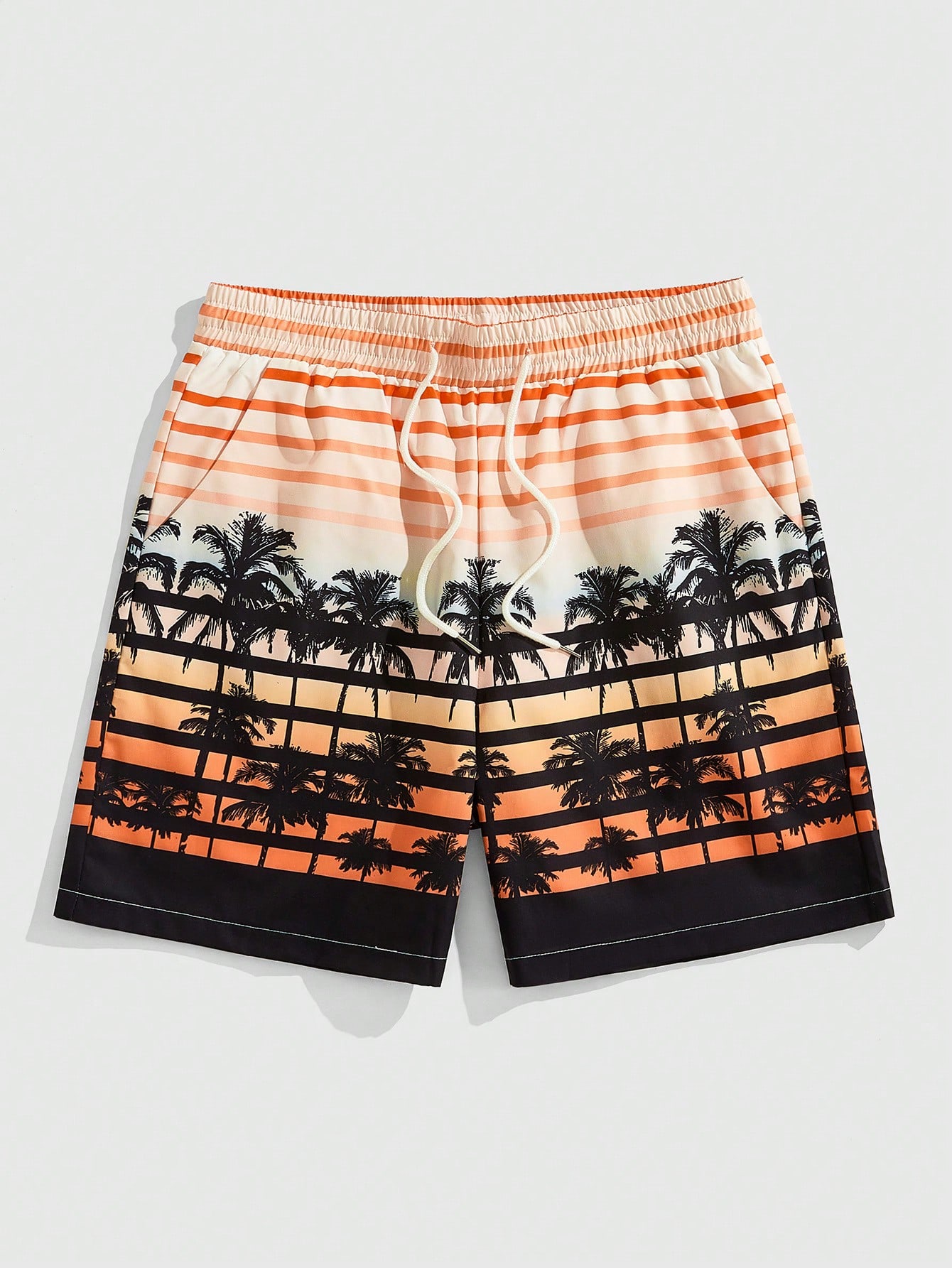 Street Life Men's Summer Beach Holiday Coconut Tree & Ombre Striped Print Drawstring Waist Shorts