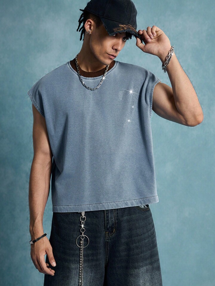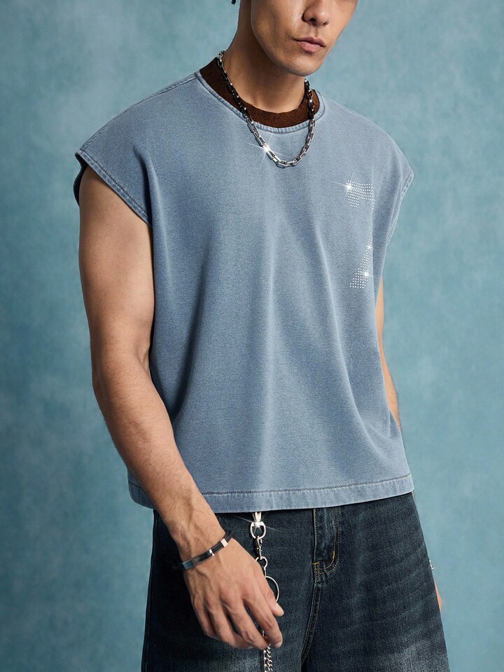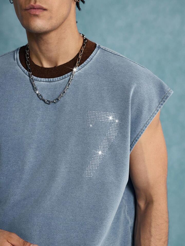 Street Life Men's Summer Casual Rhinestone Embellished Digit Denim Shirt