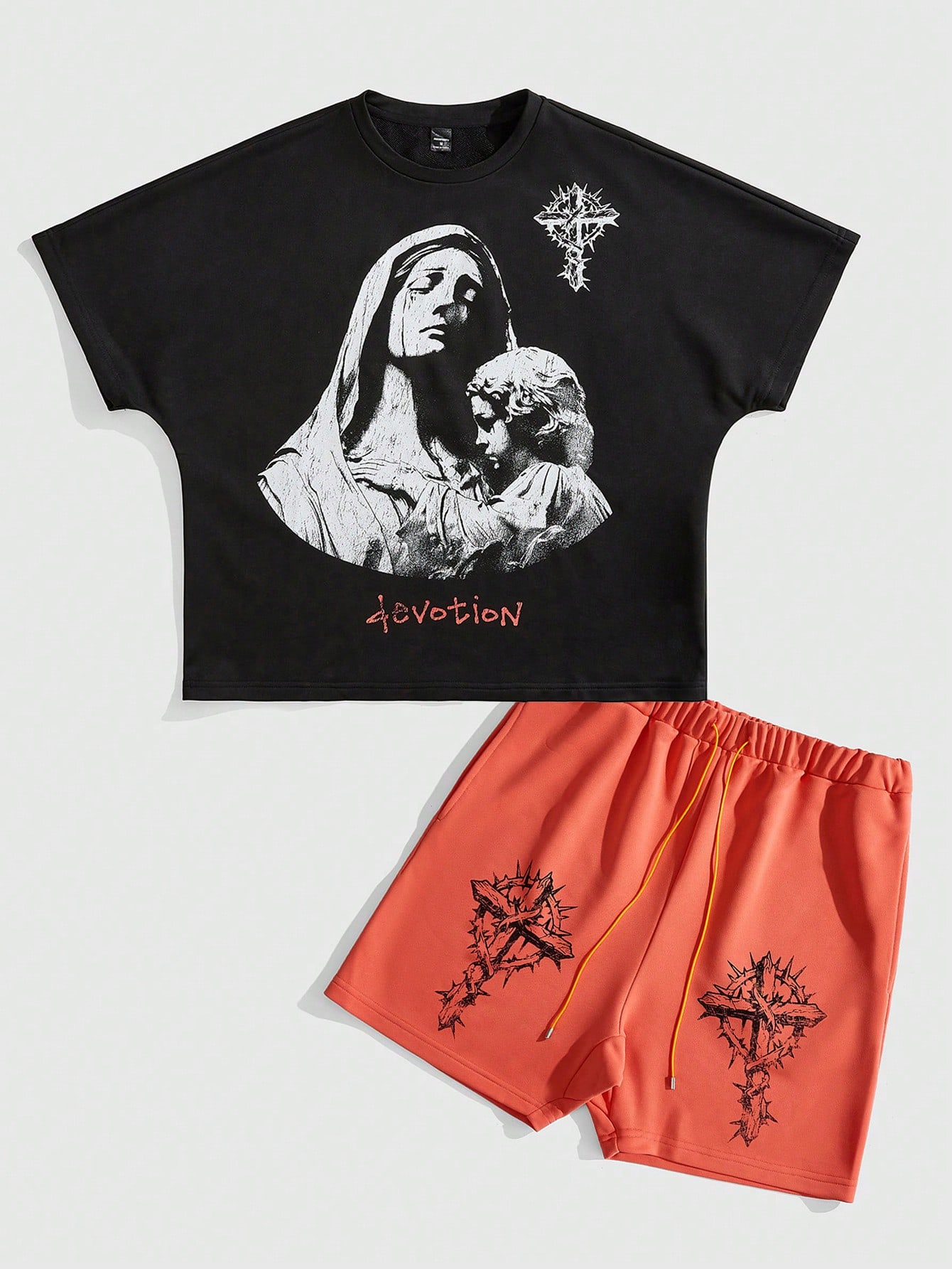 Street Life Men's Virgin Mary Print Round Neck Short Sleeve Casual T-Shirt & Drawstring Waist Shorts Set