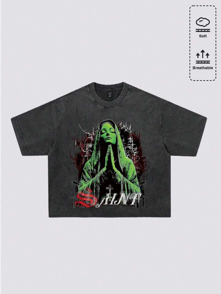 Street Life Men's Washed Vintage Printed Loose Crop T-Shirt