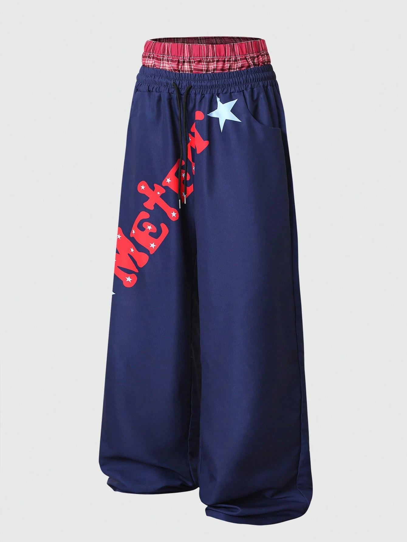Street Life Men's Wide Leg Casual Pants, Navy Blue Tone With Red Label White Star Print, Drawstring Waist For Comfort