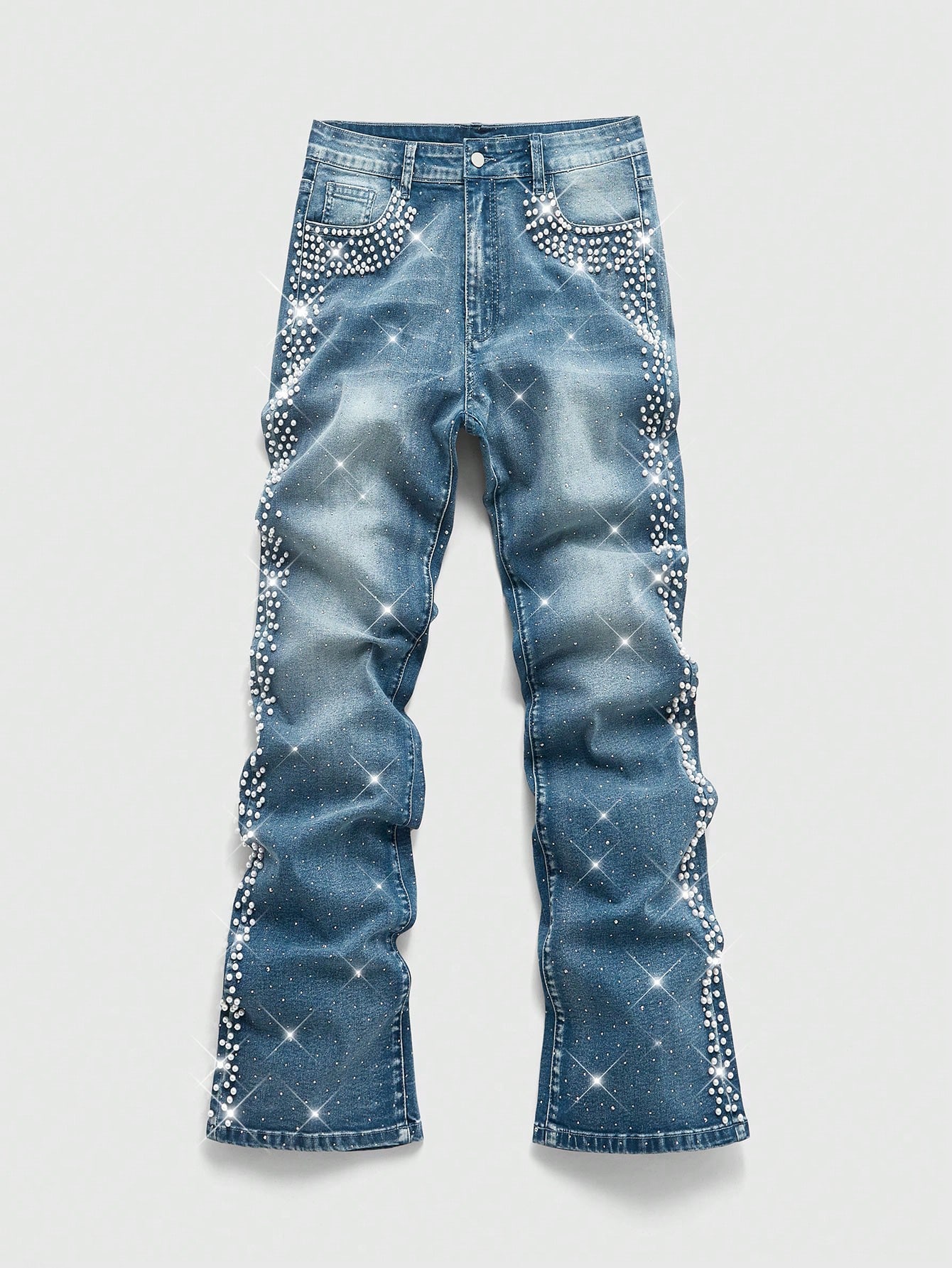 Street Life Spring Casual Graphic Men'S Pocket Rhinestone Decor Versatile Party & Commute Flared Jeans