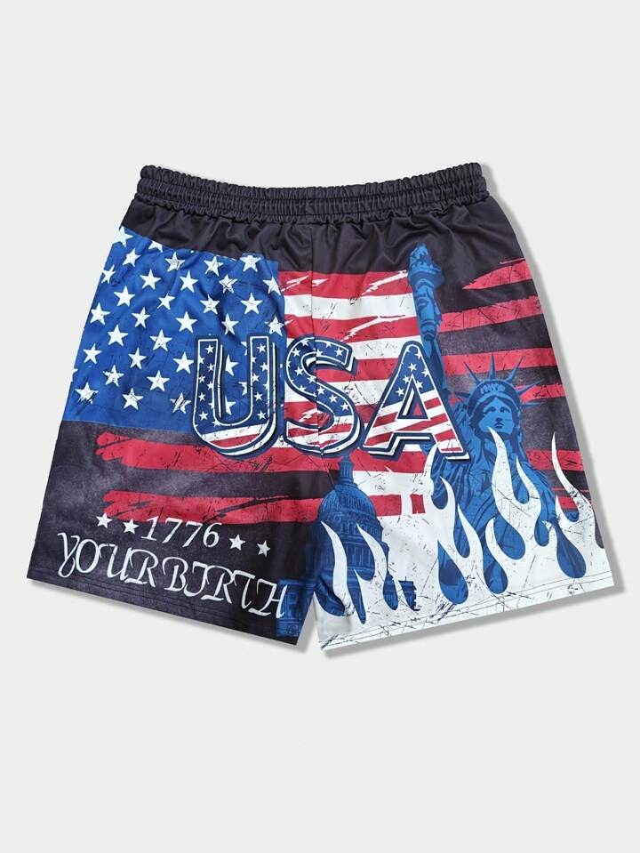 Street Life Vintage Loose Fit Men's Shorts With American Flag Graphic And Elastic Waist