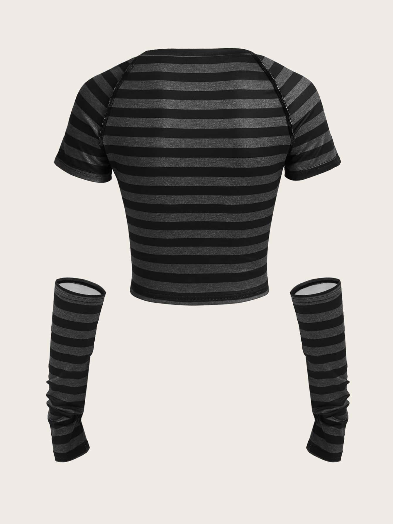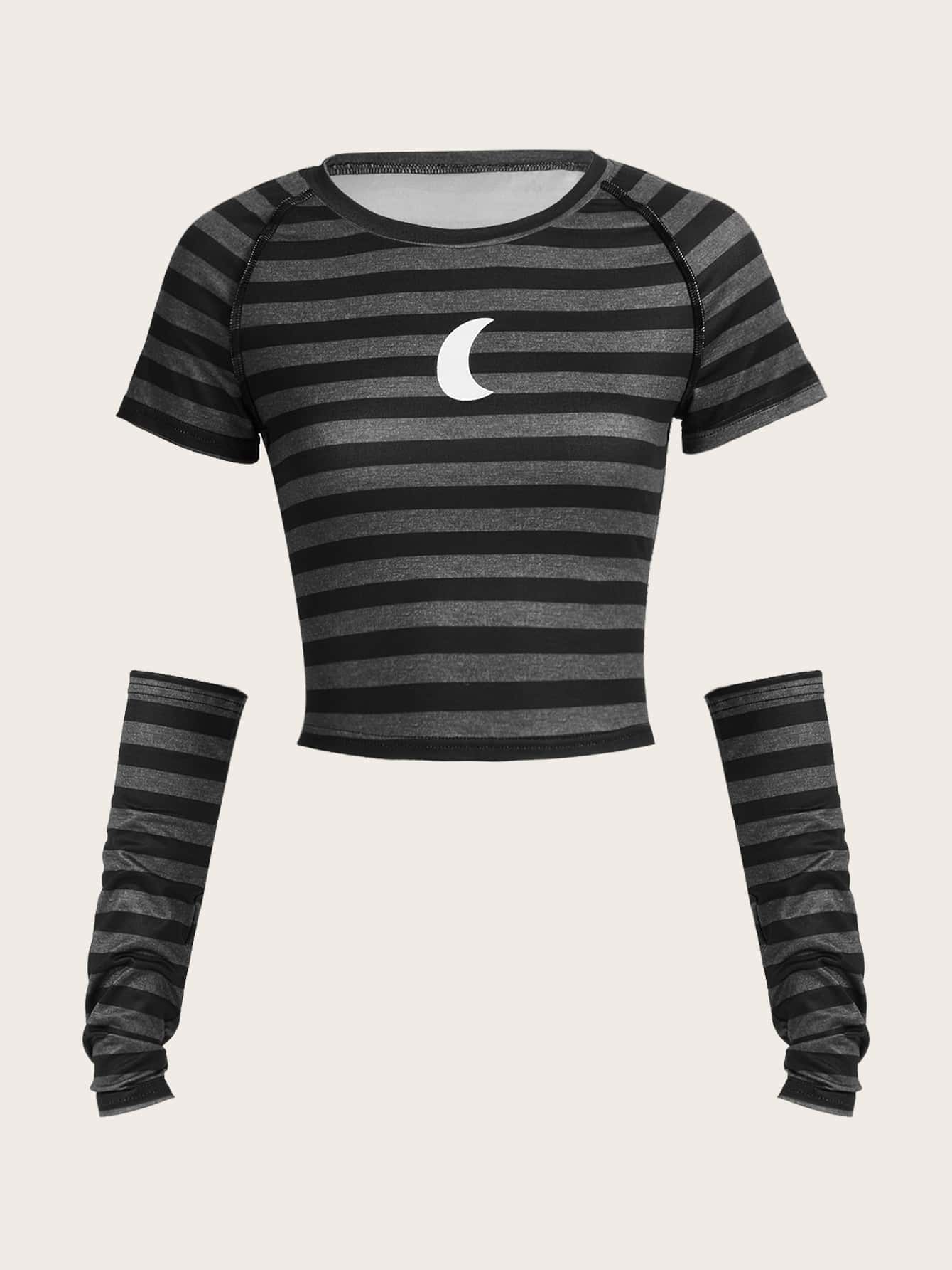 Striped Moon Print Raglan Sleeve Tee & Oversleeves