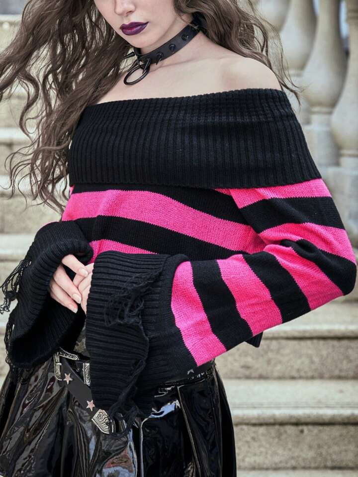 Striped Off Shoulder Flare Sleeve Sweater