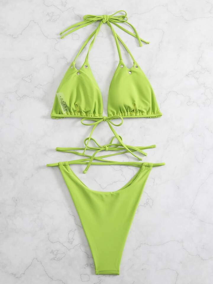 Studded Detail Triangle High Cut Summer Beach Bikini Set