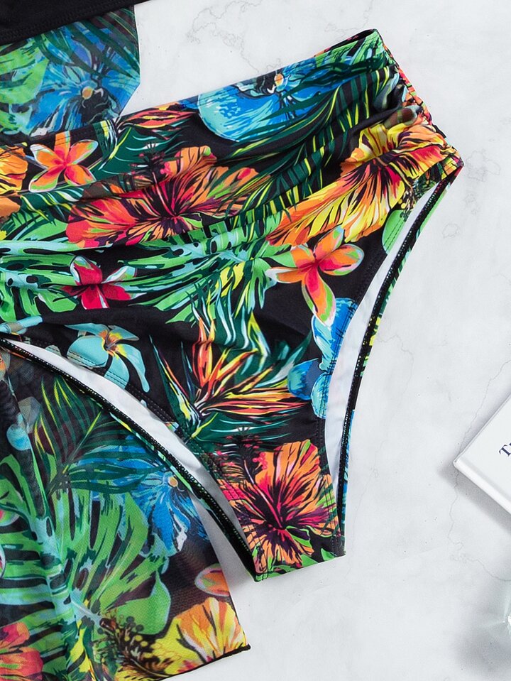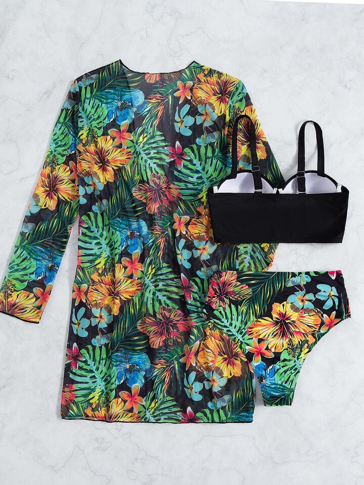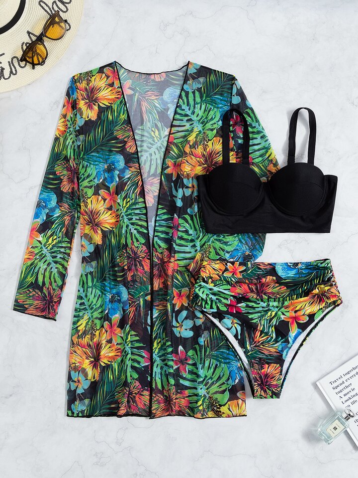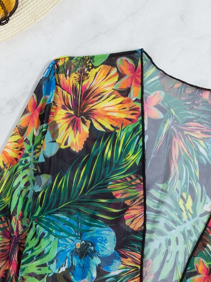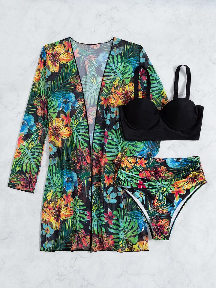 Summer Beach 3packs Tropical Print Push Up High Waisted Bikini & Kimono