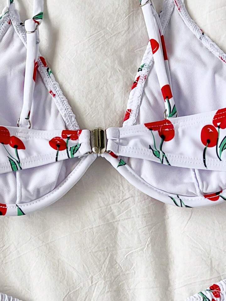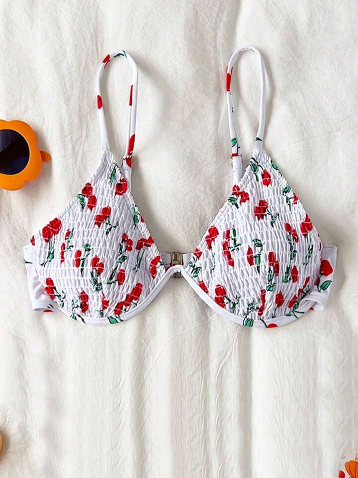 Summer Beach Cherry Print Smocked Underwire Bikini Top
