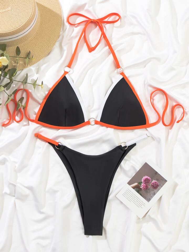 Summer Beach Contrast Binding Ring Linked Triangle Bikini Set