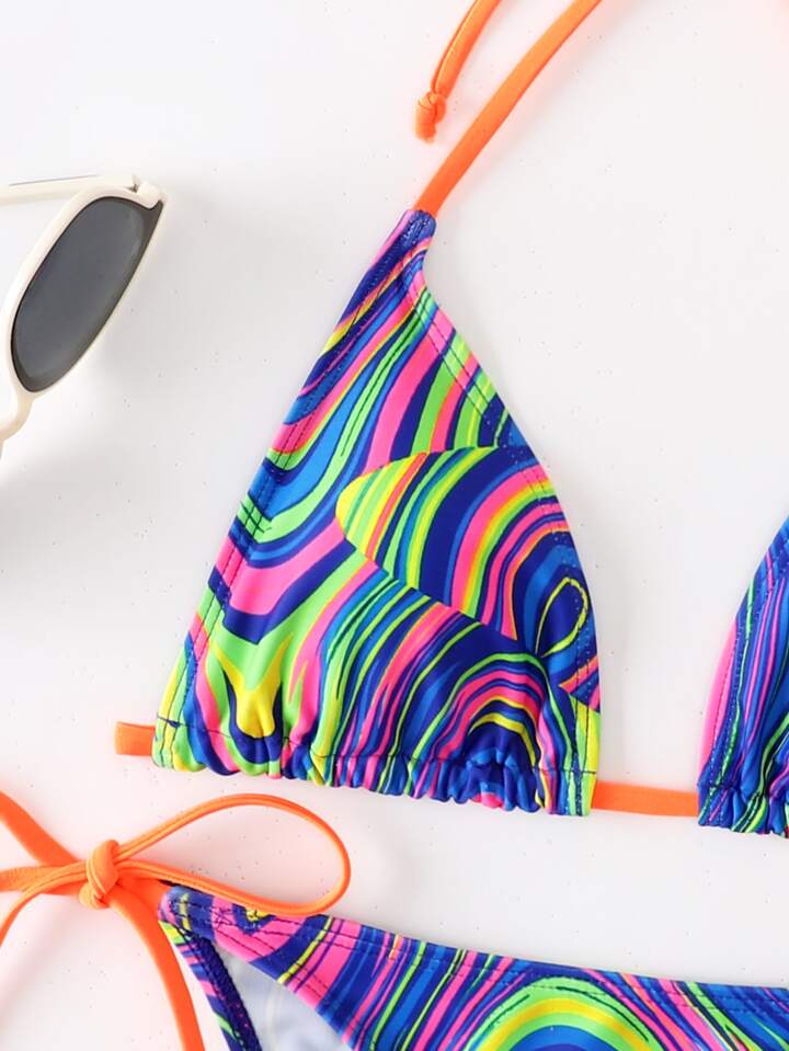 Summer Beach Fluid Pattern Bikini Set Halter Micro Triangle Bra Top & Tie Side Bikini Bottom 2 Piece Bathing Suit