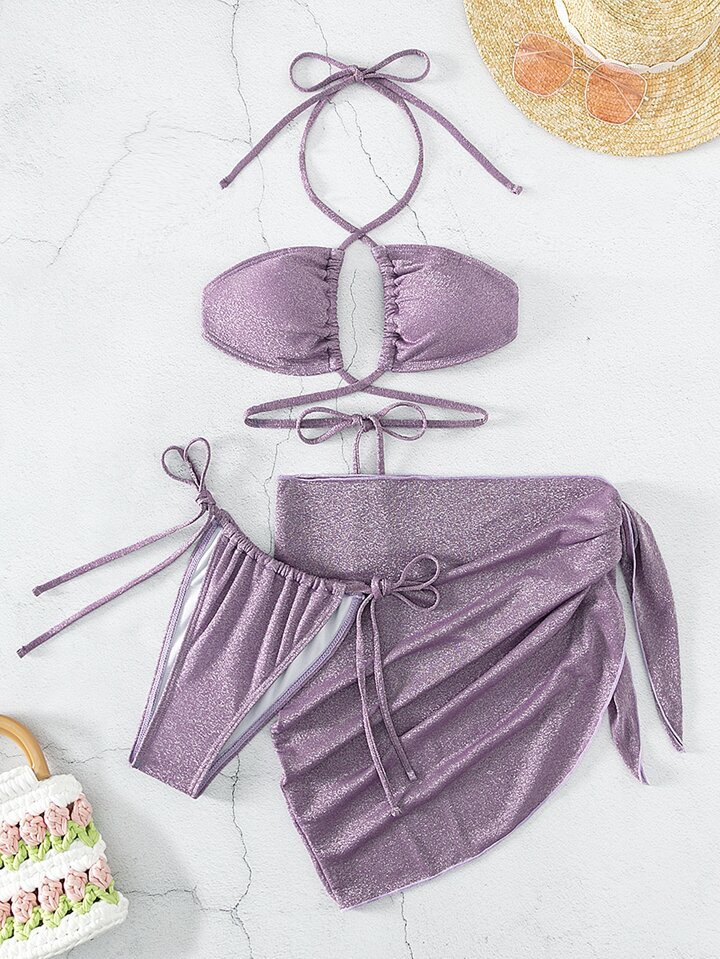 Summer Beach Glitter Bikini Set Halter Bra & Tie Side Bottom & Beach Skirt 3 Piece Bathing Suit
