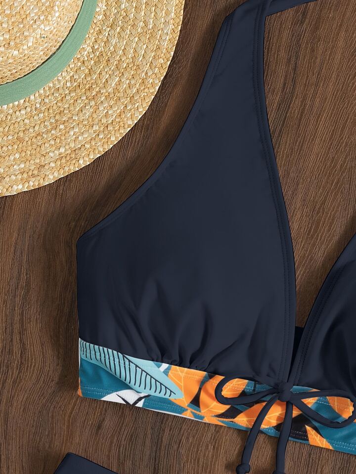 Summer Beach Random Leaf Print Bikini Set Tie Front Halter Bra & Dolphin Shorts 2 Piece Bathing Suit