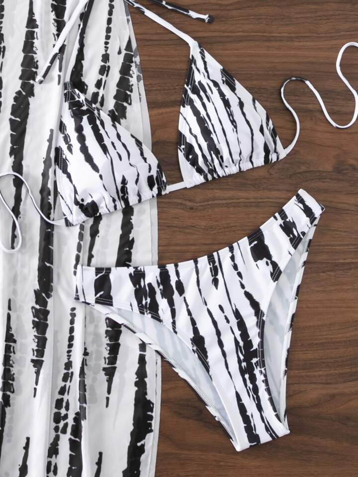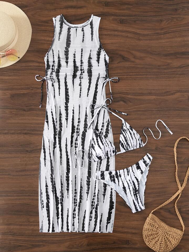 Summer Beach Tie Dye Bikini Set Halter Triangle Bra & Cheeky Bottom & Drawstring Ruched Cover Up Dress 3 Pieces Bikini
