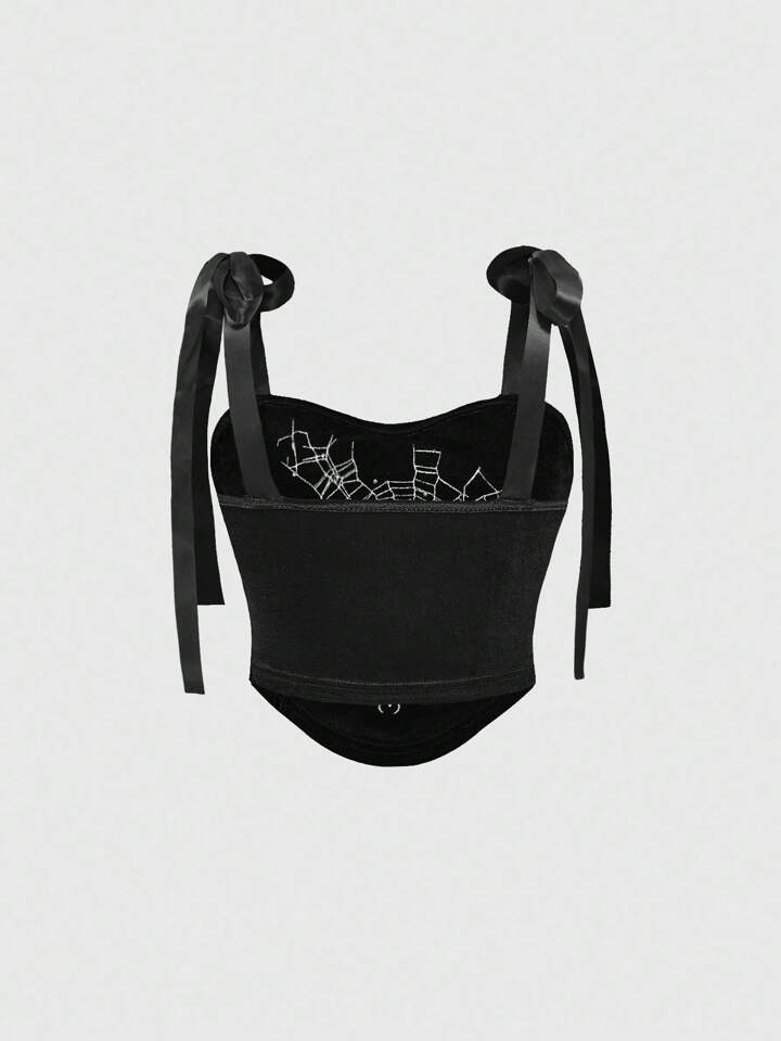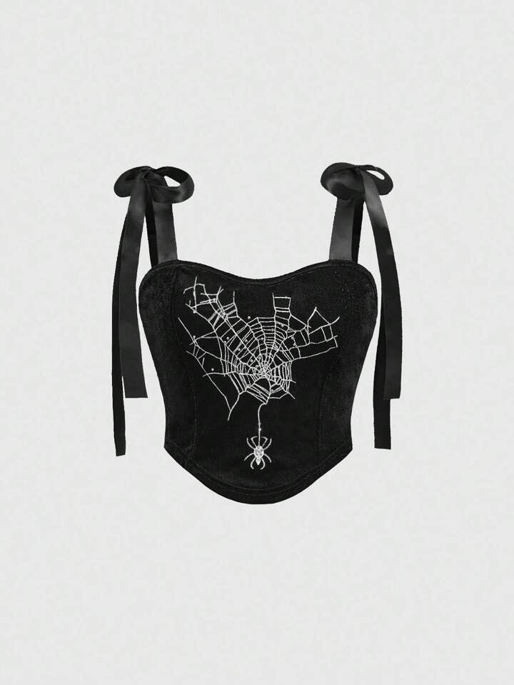 Summer : Gothic Palace Spider Embroidery & Rhinestone Decor Square Neck Lace-Up Cami Crop Top