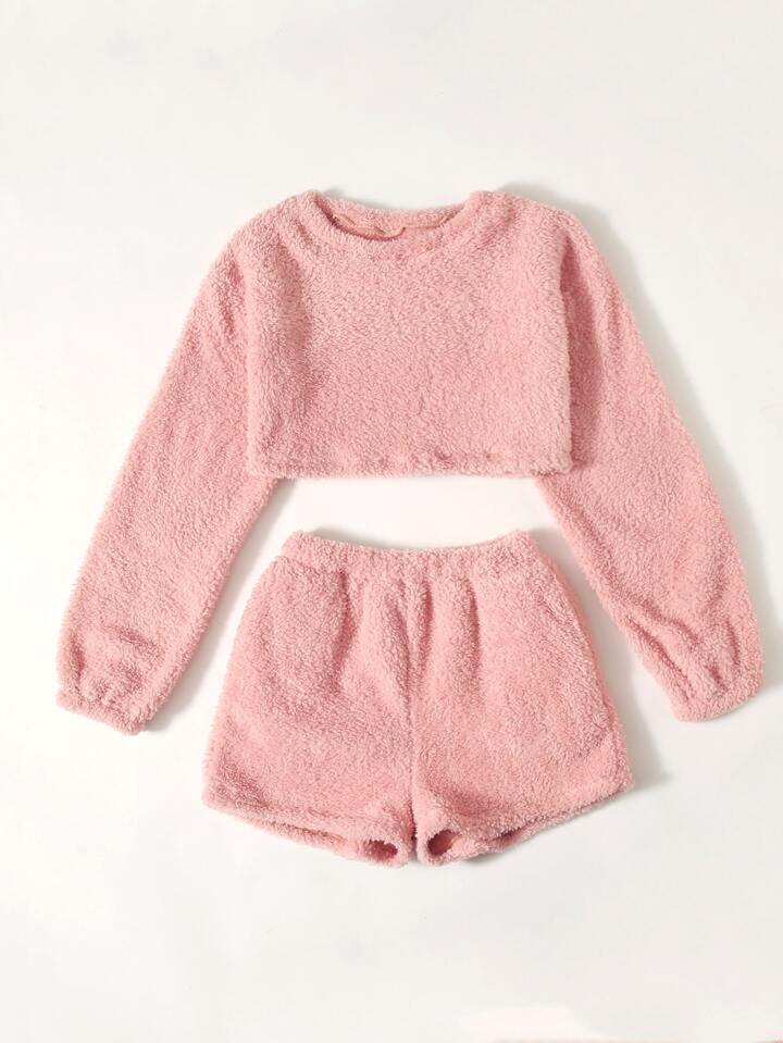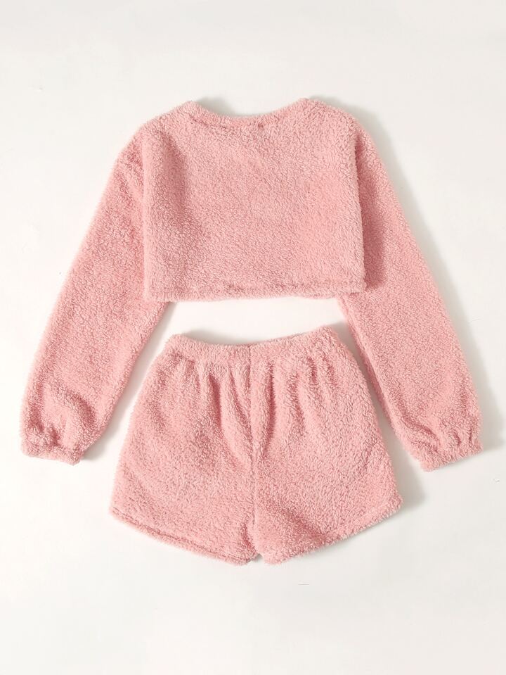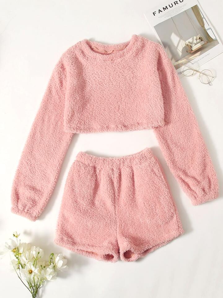 Teddy Solid Crop Top & Shorts Lounge Set