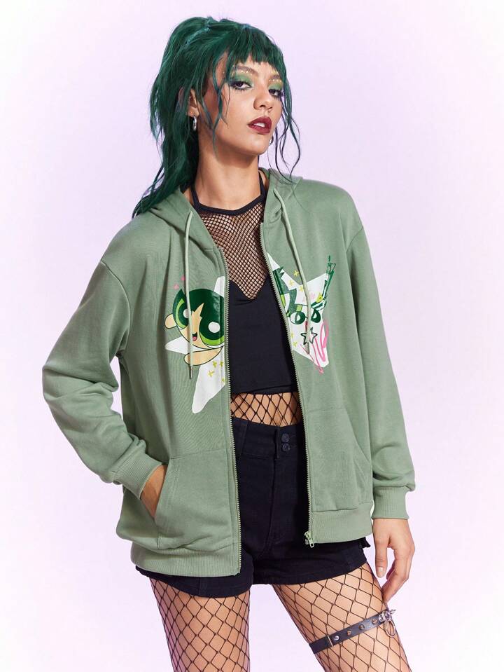 The Powerpuff Girls | ROMWE Cartoon Graphic Zip Up Drawstring Hoodie
