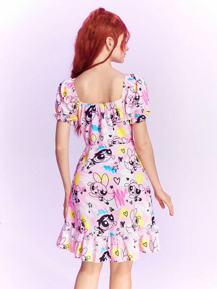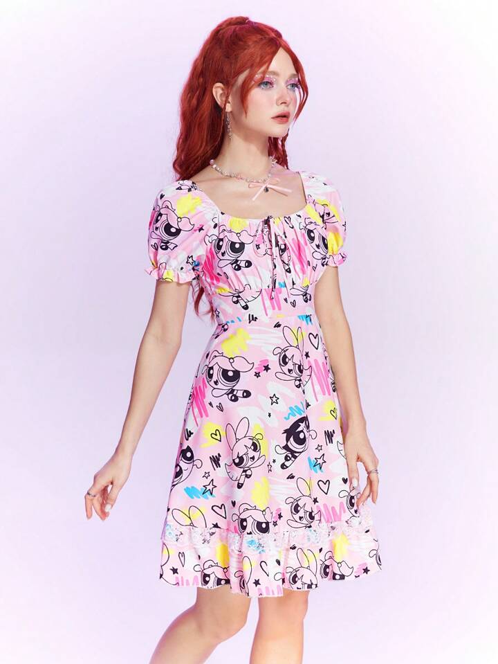 The Powerpuff Girls | ROMWE Cartoon Pattern Square Neck Puff Sleeve Dress