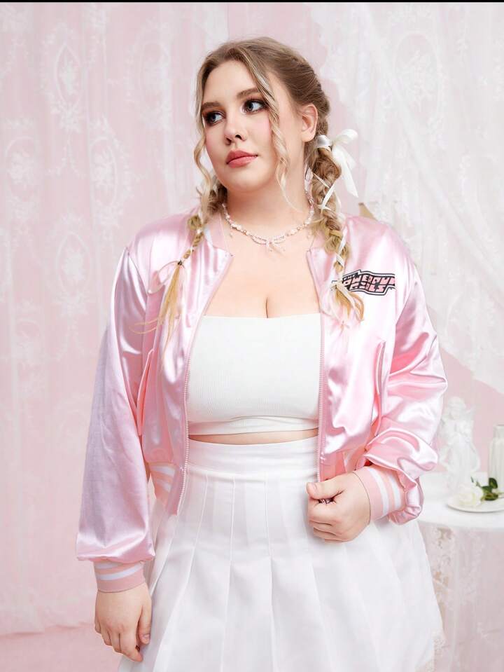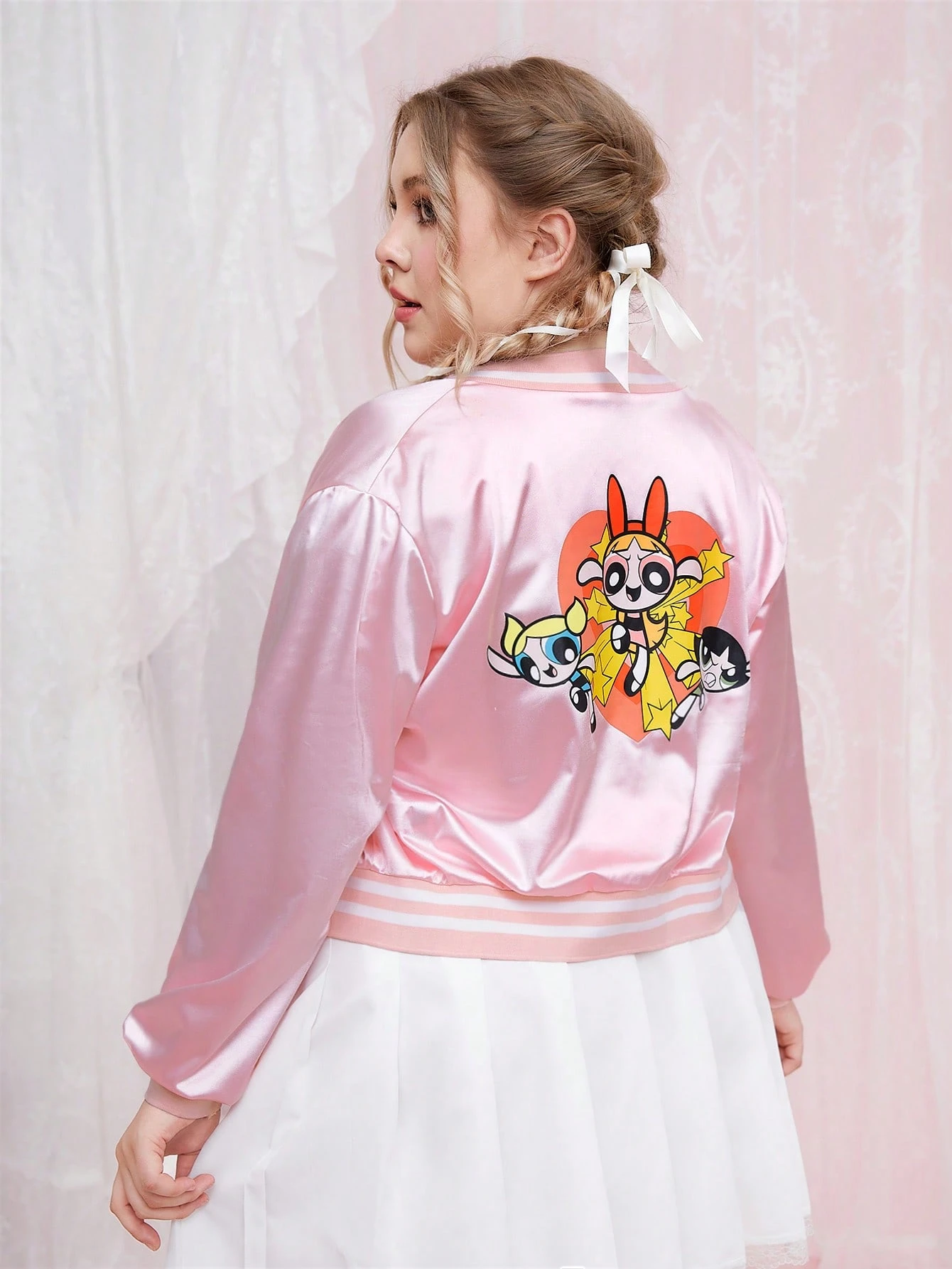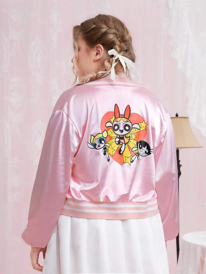 The Powerpuff Girls | ROMWE Plus Cartoon Graphic Striped Trim Satin Bomber Jacket